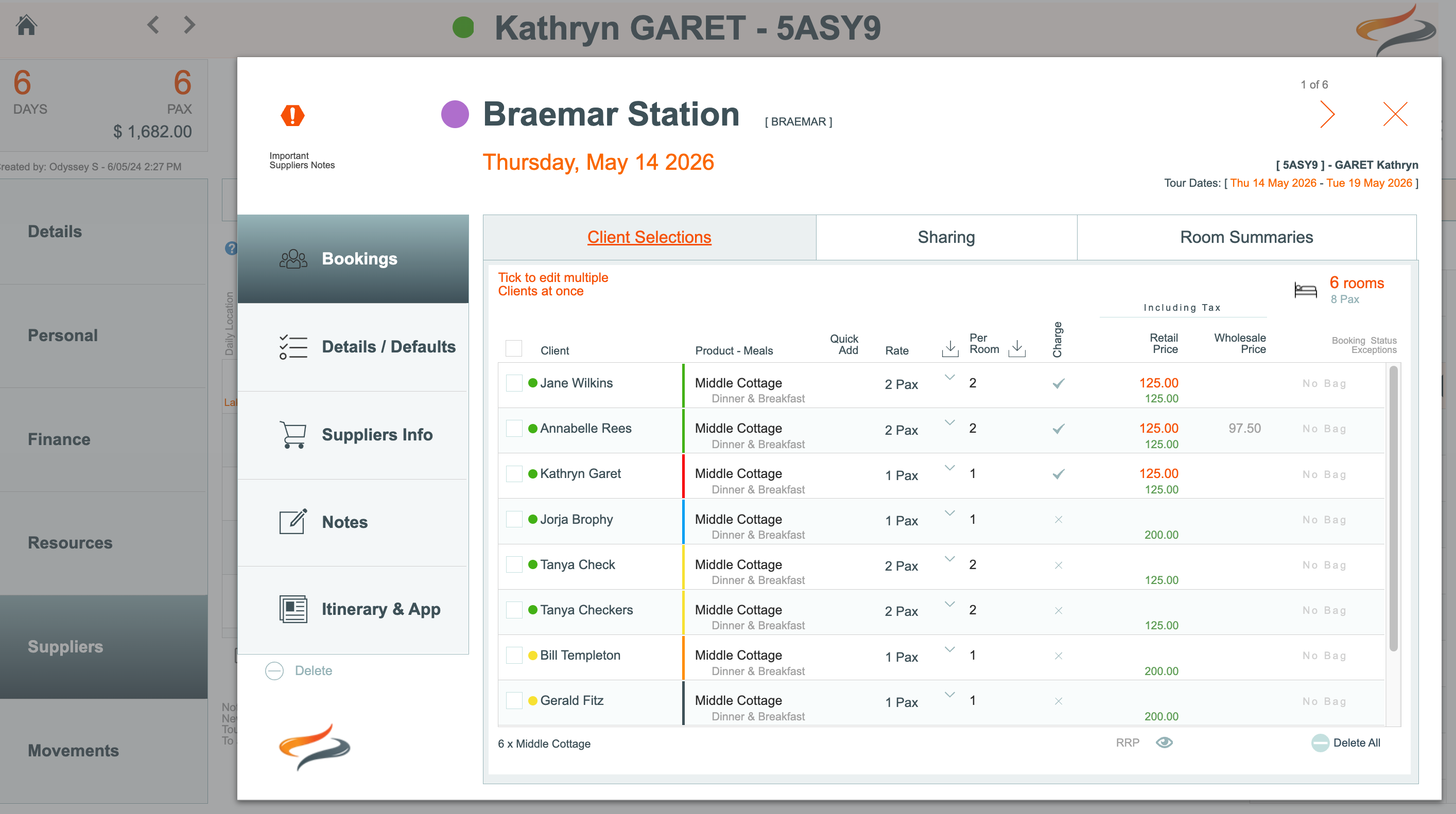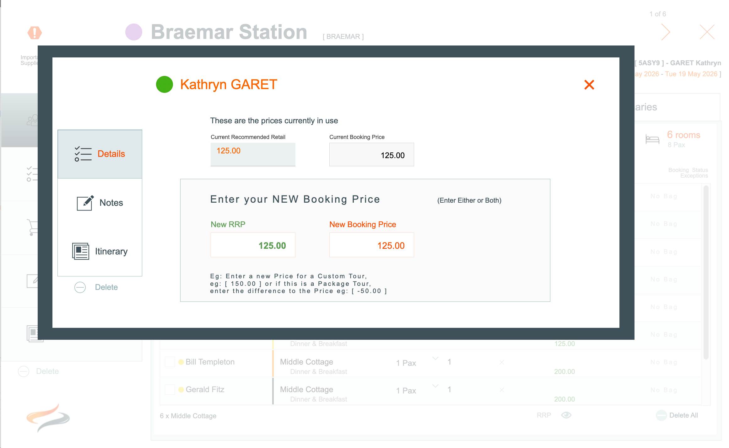 - change the Provider Product, Meal option with this Provider, Rate option, PAX per room, whether it is to be charged or not, whether agent commission applies, whether this client is an exception to the Provider's booking status (e.g. confirmed), and override the price