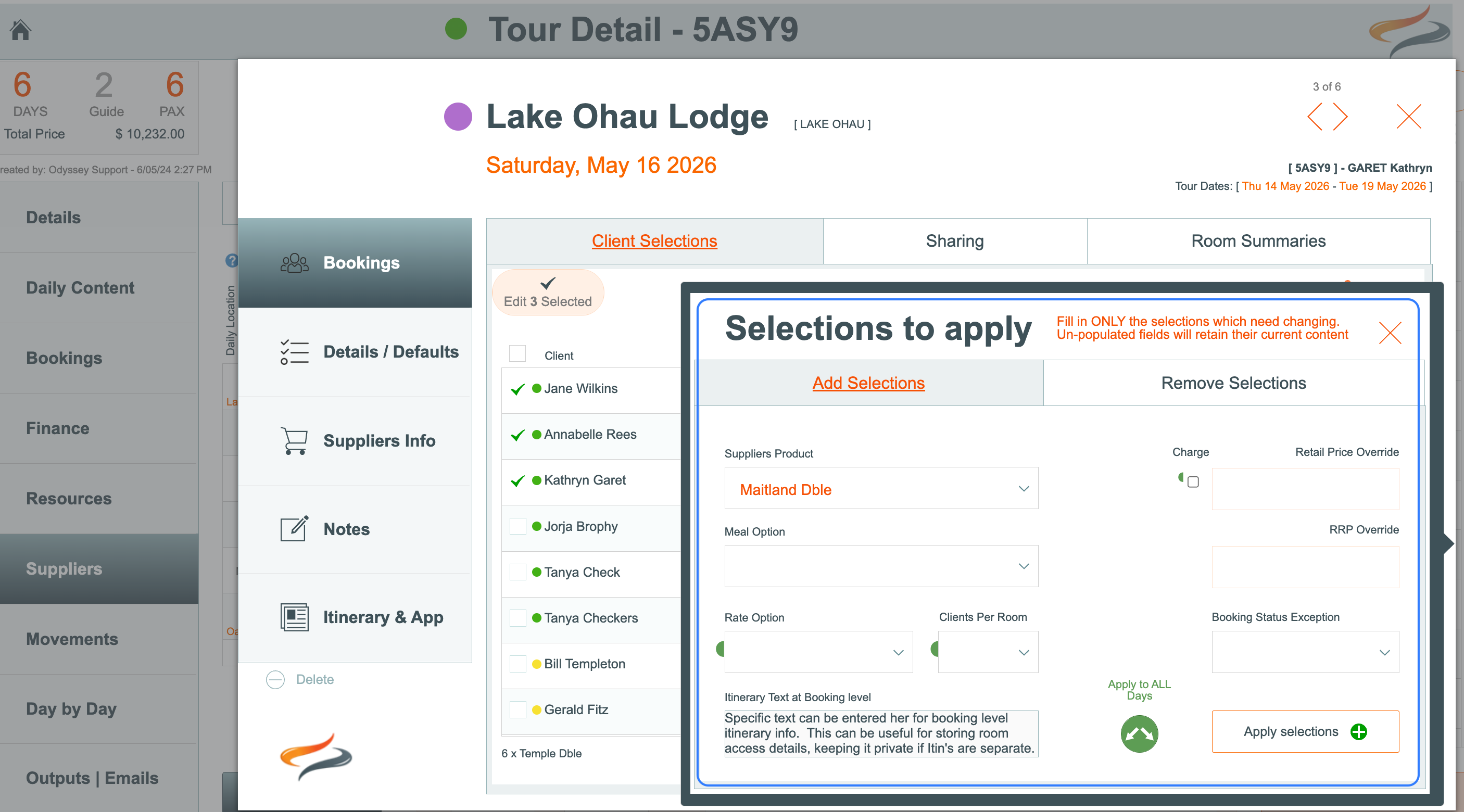 - make other selections as required, e.g. charge for this booking, PAX per room, pax rate, agent commission, meal, provider task status, changes to Notes and Itinerary for this booking