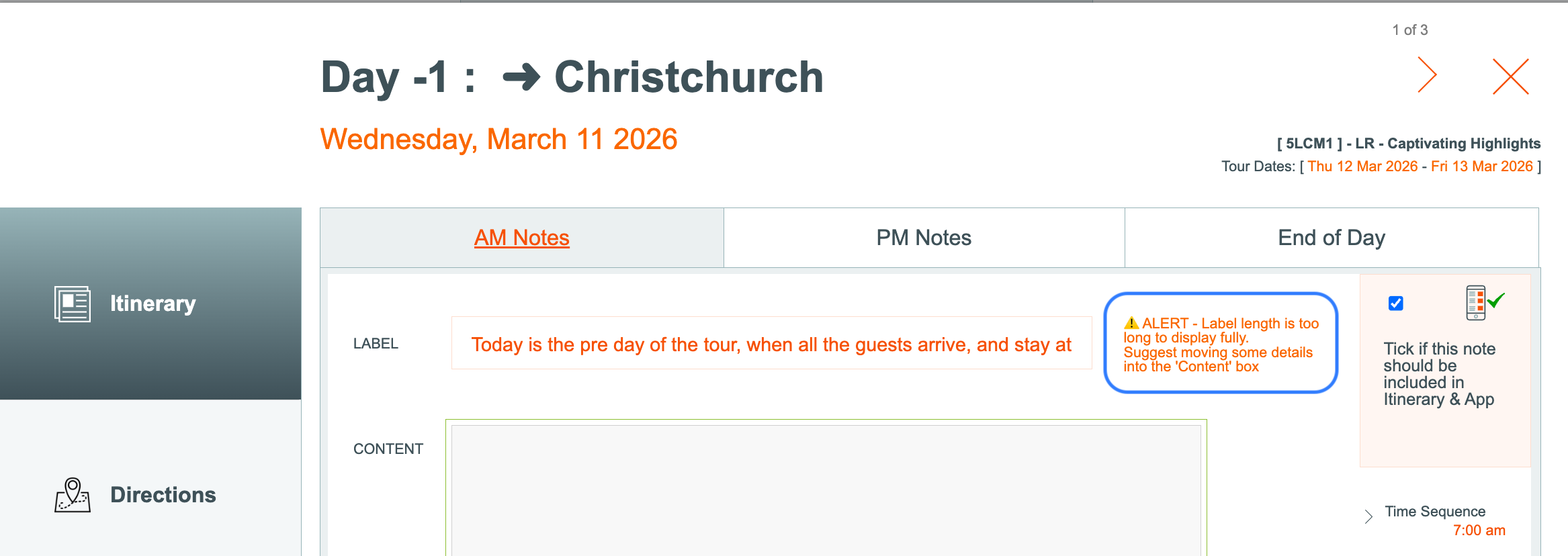 - add or edit the morning or afternoon text by clicking on the am or pm tab. You will still have full control over this text in the Tours/Departures based off this Master, AND when you produce the itinerary :-)