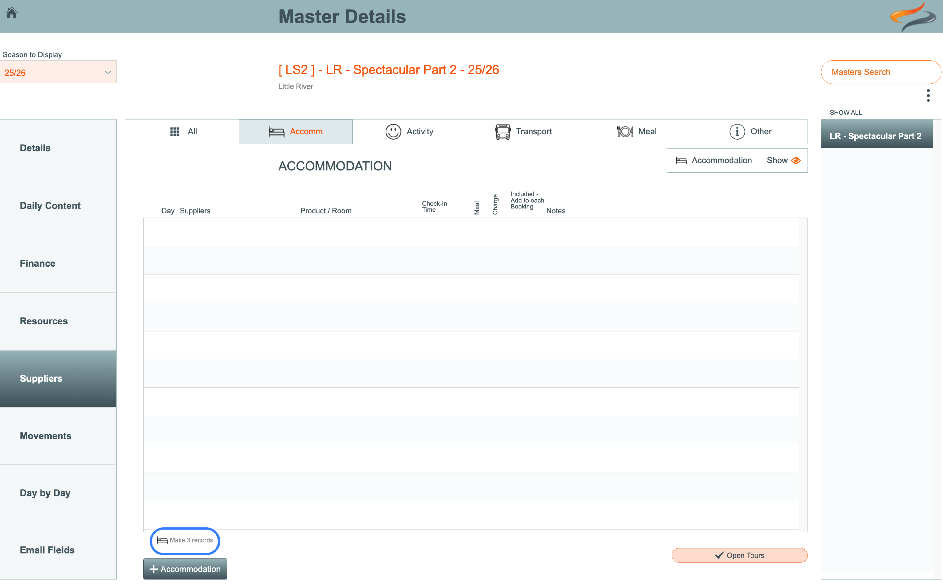 Special Note: for Accommodation providers only, if there are NO provider records created yet, there is a special button called "Make # records" which will automatically create one blank accommodation provider record for each day of the tour (listed in daily locations).