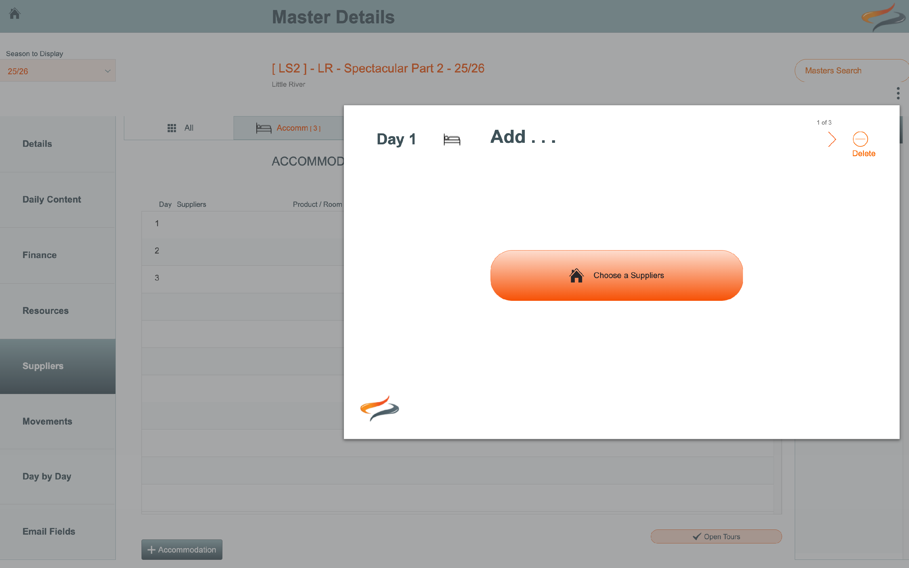 - Day number - the day number of the tour that this provider is used is displayed, and it can be moved by using the < > arrows. The location of the selected day is shown above the field.