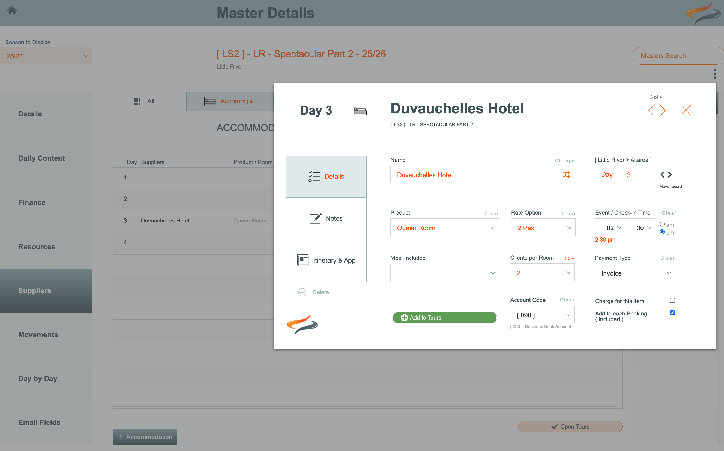 - The Provider has now been added to your master, and you can continue populating the details required from this Provider on your Master. (e.g. Room selection, check in time, notes and Itinerary content)