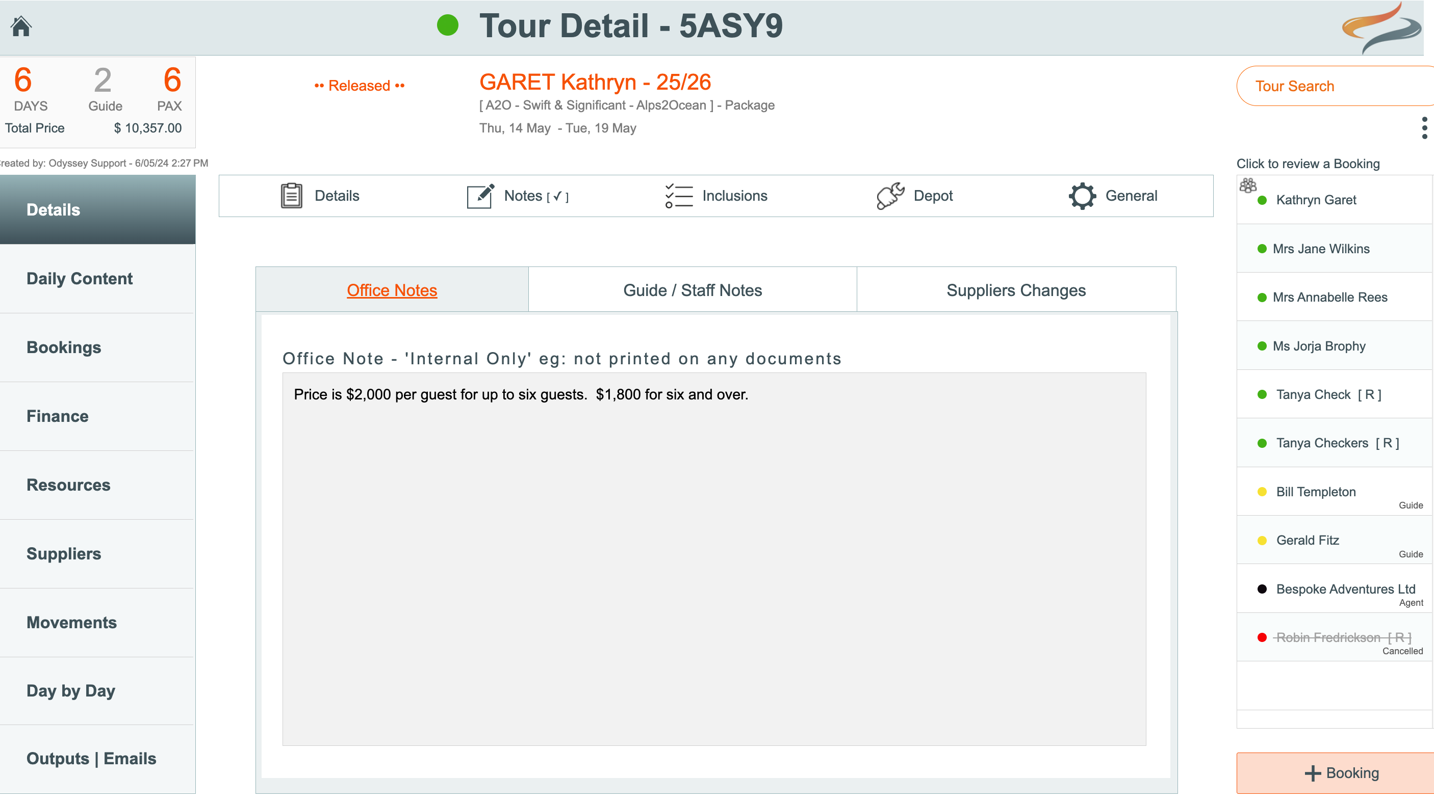 - The Tour | Details | Notes | Office tab provides you with a space to record Office Notes - something about this Departure that could be of interest; For example, you may be explaining why a discount has been applied, or perhaps a group of them are arriving on a flight which has had its arrival time rescheduled, to explain the price brackets for this trip, what age or fitness level it is best suited to, or even to record all of your email conversations with the group. or anything you want to record for internal purposes only.
