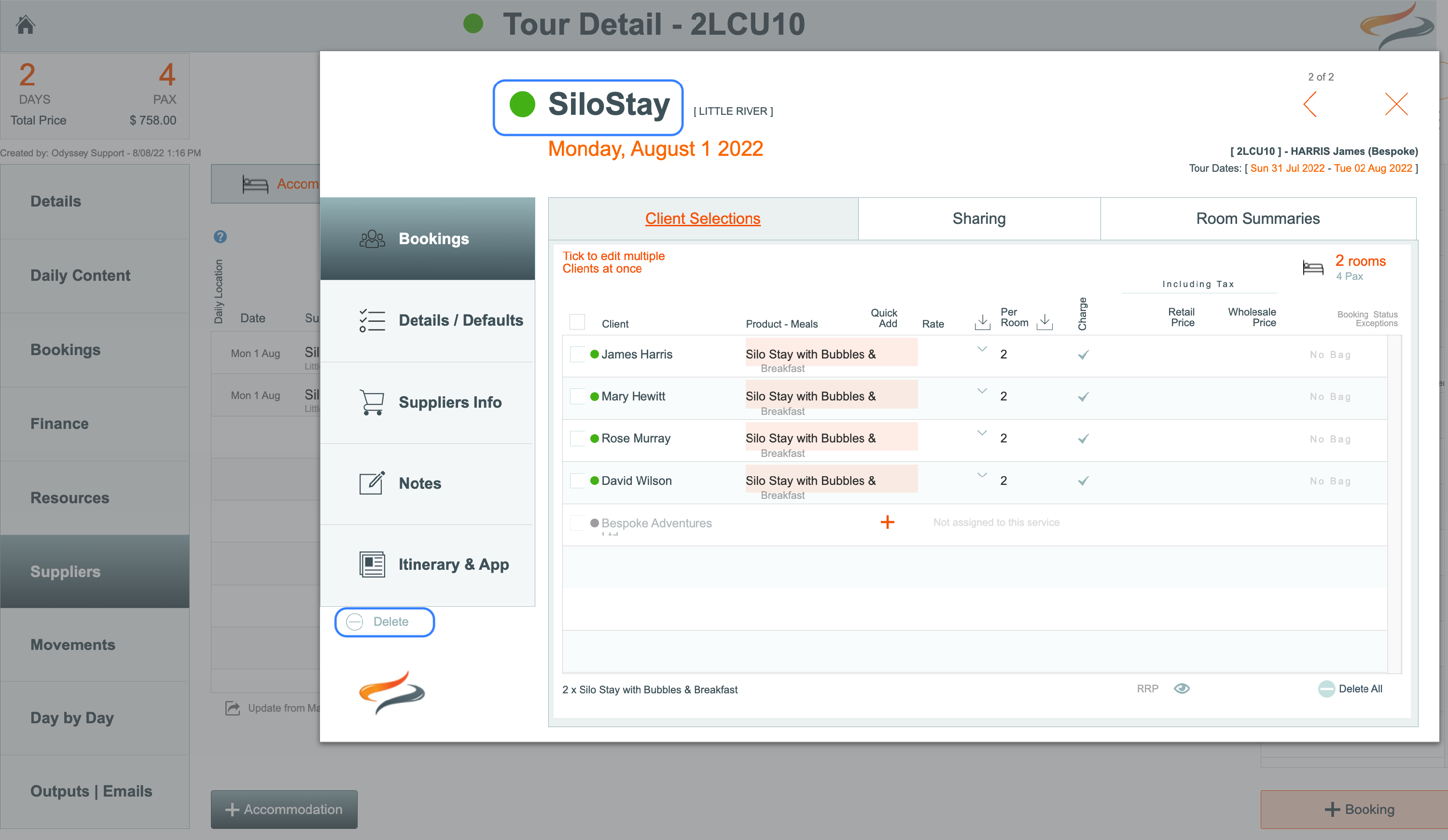 - From the pop up menu, if there are client's booked at this accommodation, they will all have to be manually deleted before the Provider can be deleted from the Tour