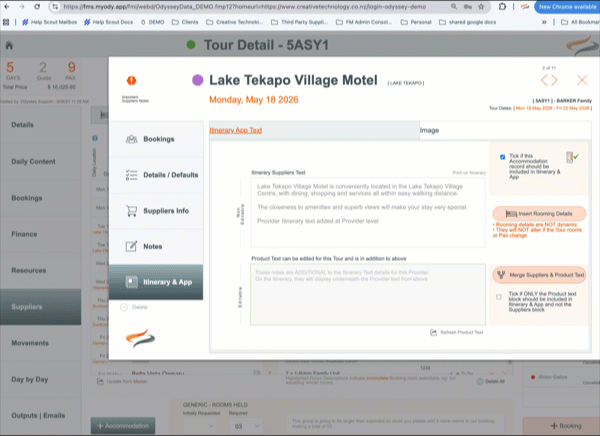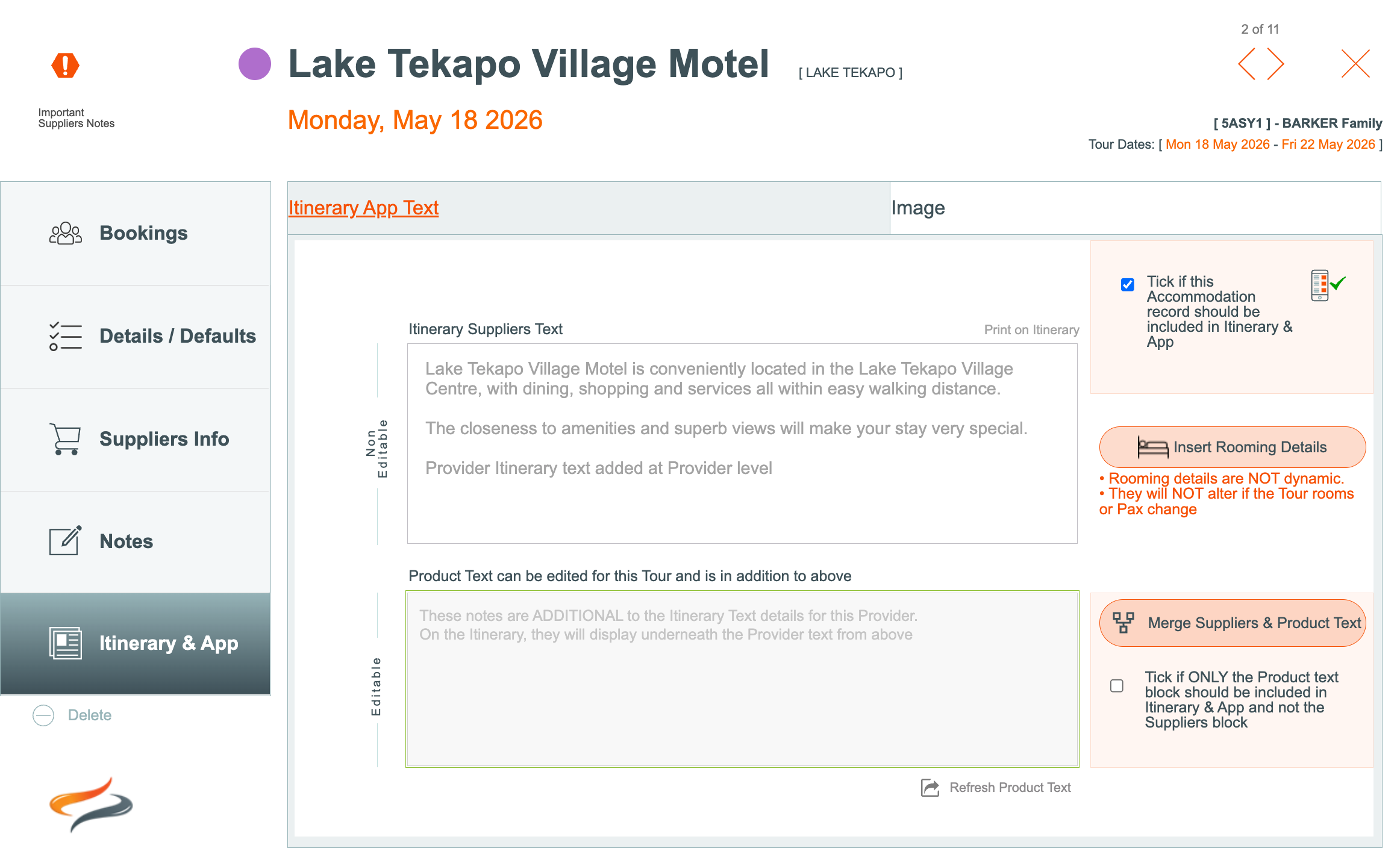 - a tickbox to indicate if this text should be displayed in the Itinerary or not. This can still be altered when creating the Itinerary.