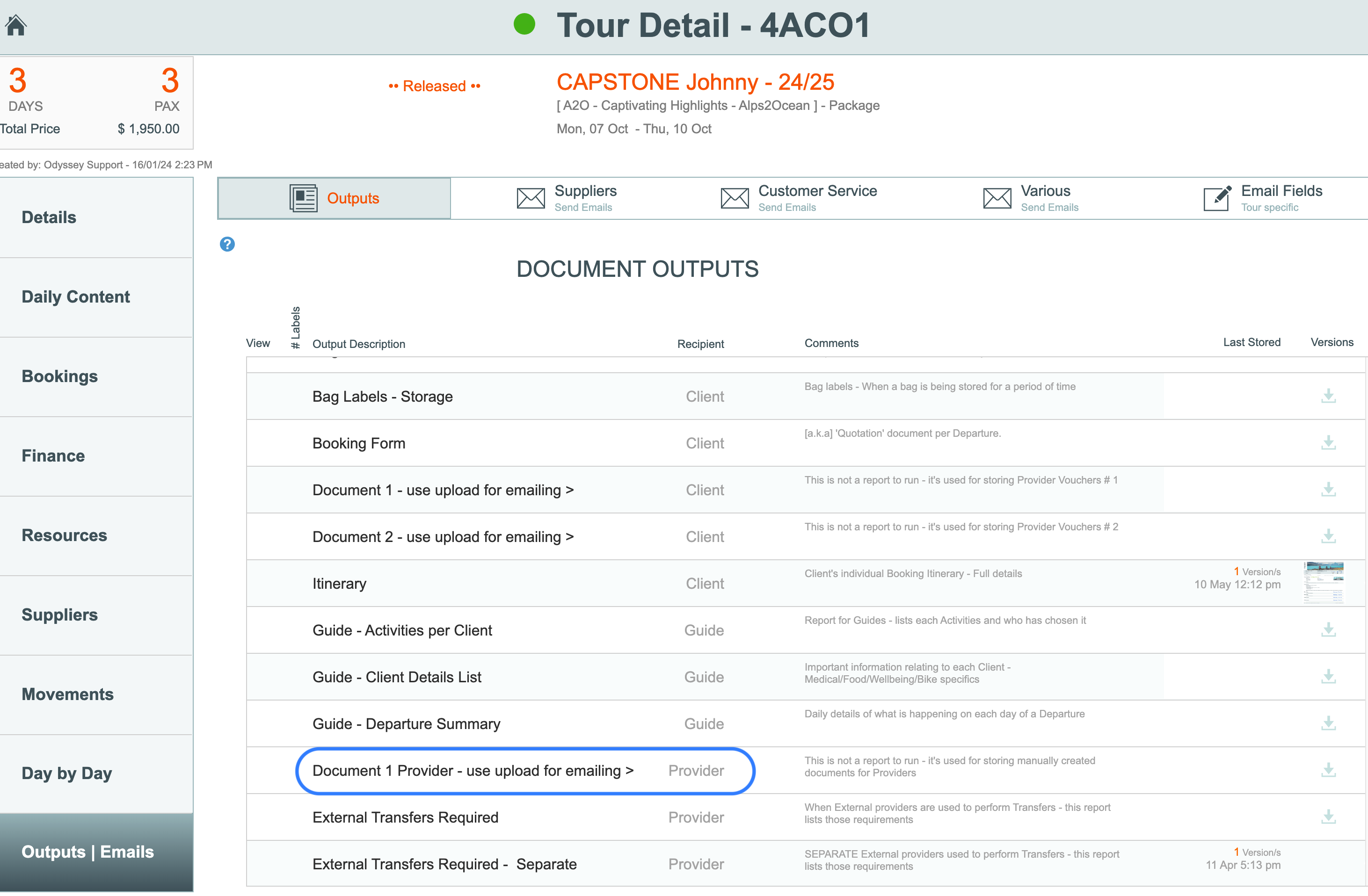 - store the outputs in readiness to email it to the client (eg Itinerary, and then push it to the mobile app) or Provider (eg rooming list)
