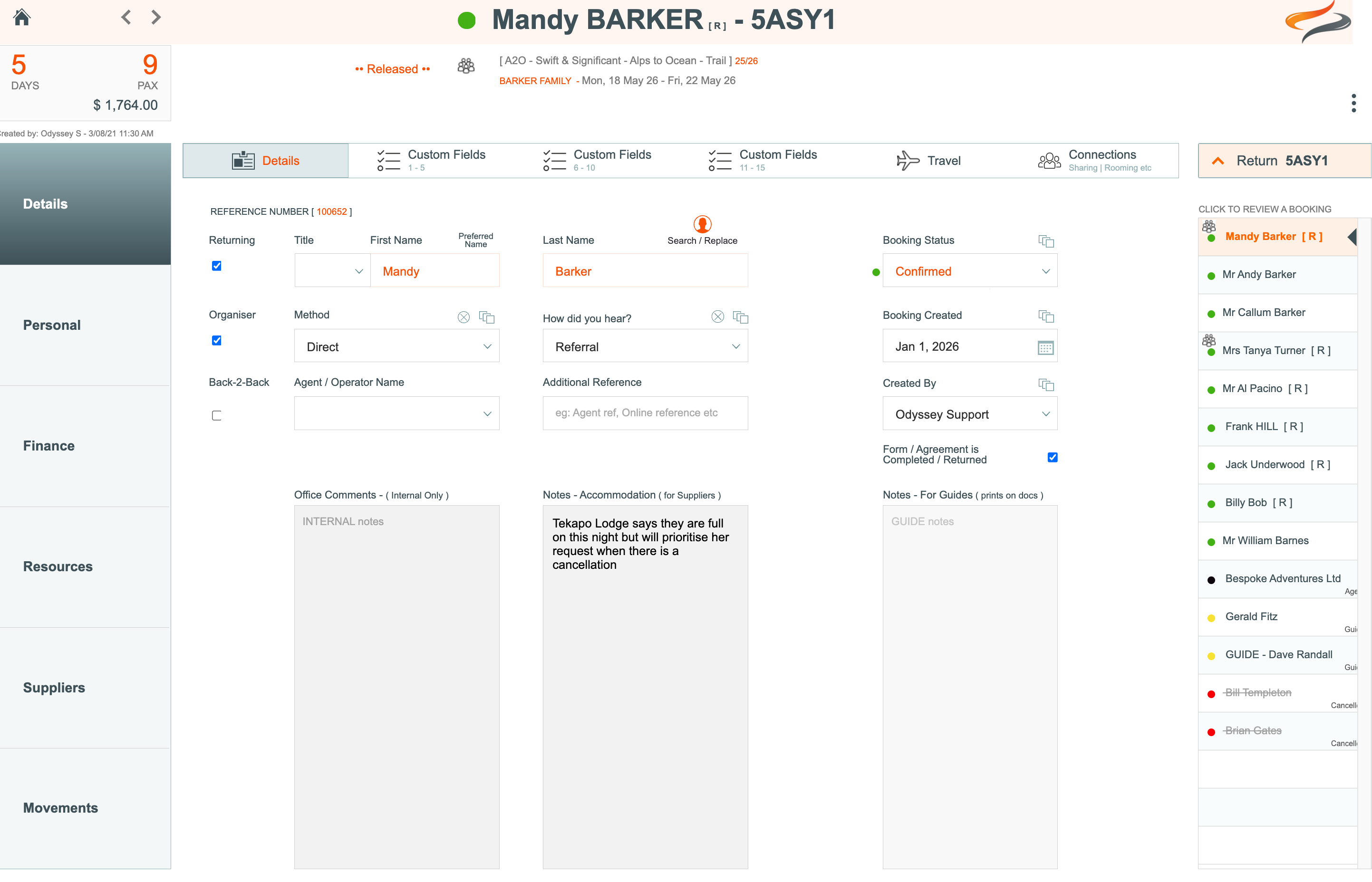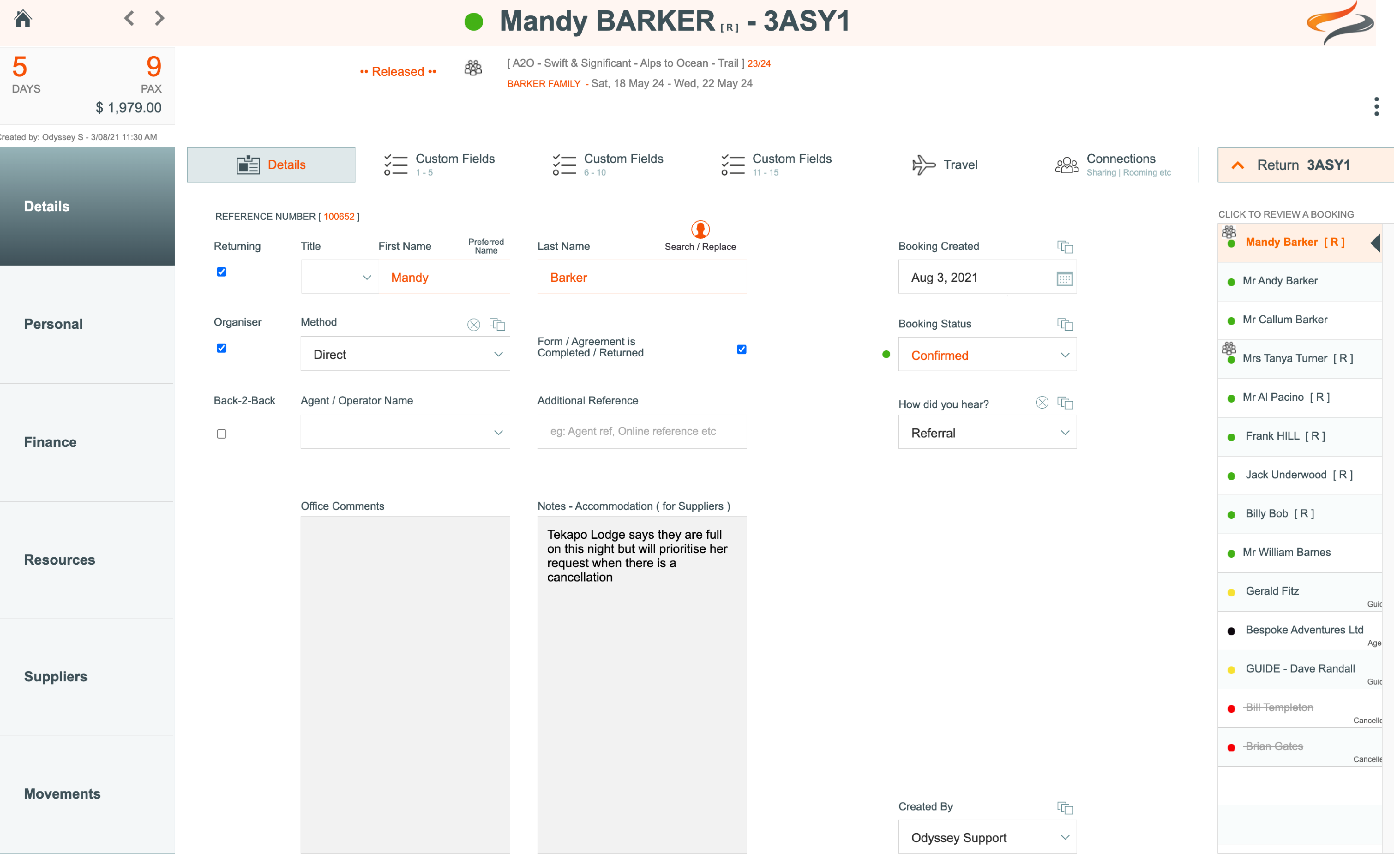 By clicking on a Booking name (i.e. a client booking) you are taken into the Booking Level of a Tour. See in the example below, that the client booking name is now at the top of the screen, in a peach colour banner.