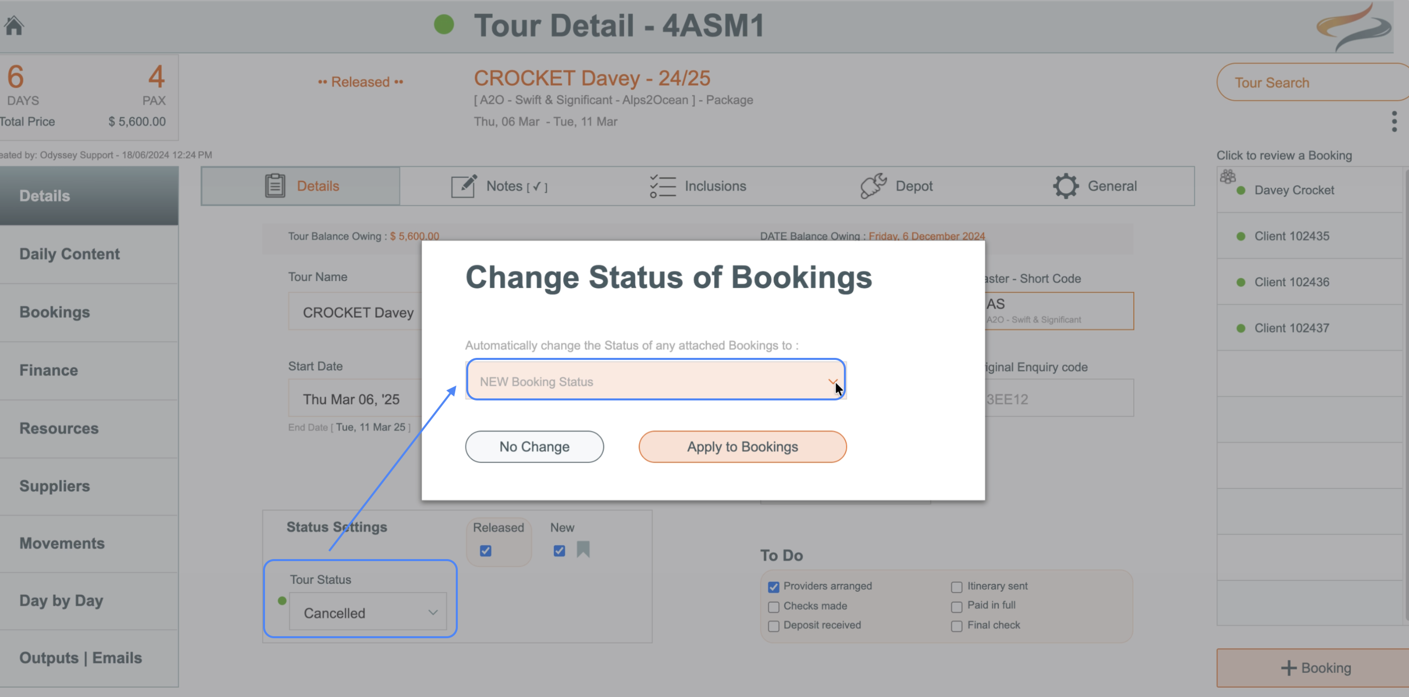 - Click Apply to Bookings if you wish the cancellation status to be applied to all Bookings, or select No Change if the booking status should remain unchanged. Perhaps you will be moving these bookings to another Tour, for example.