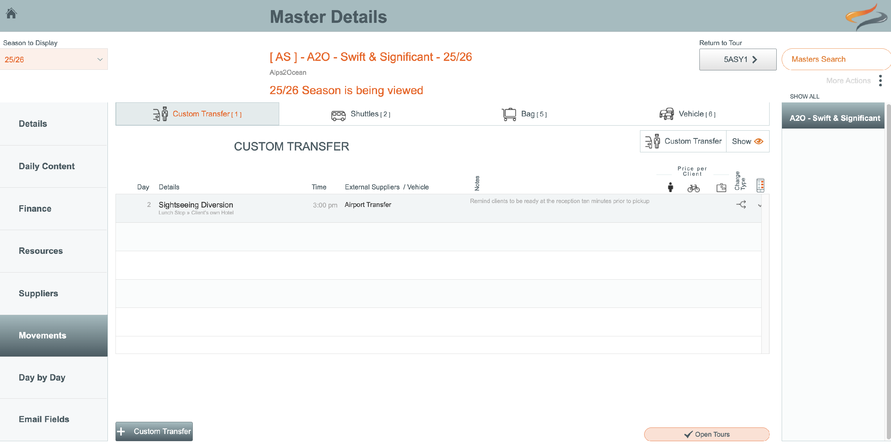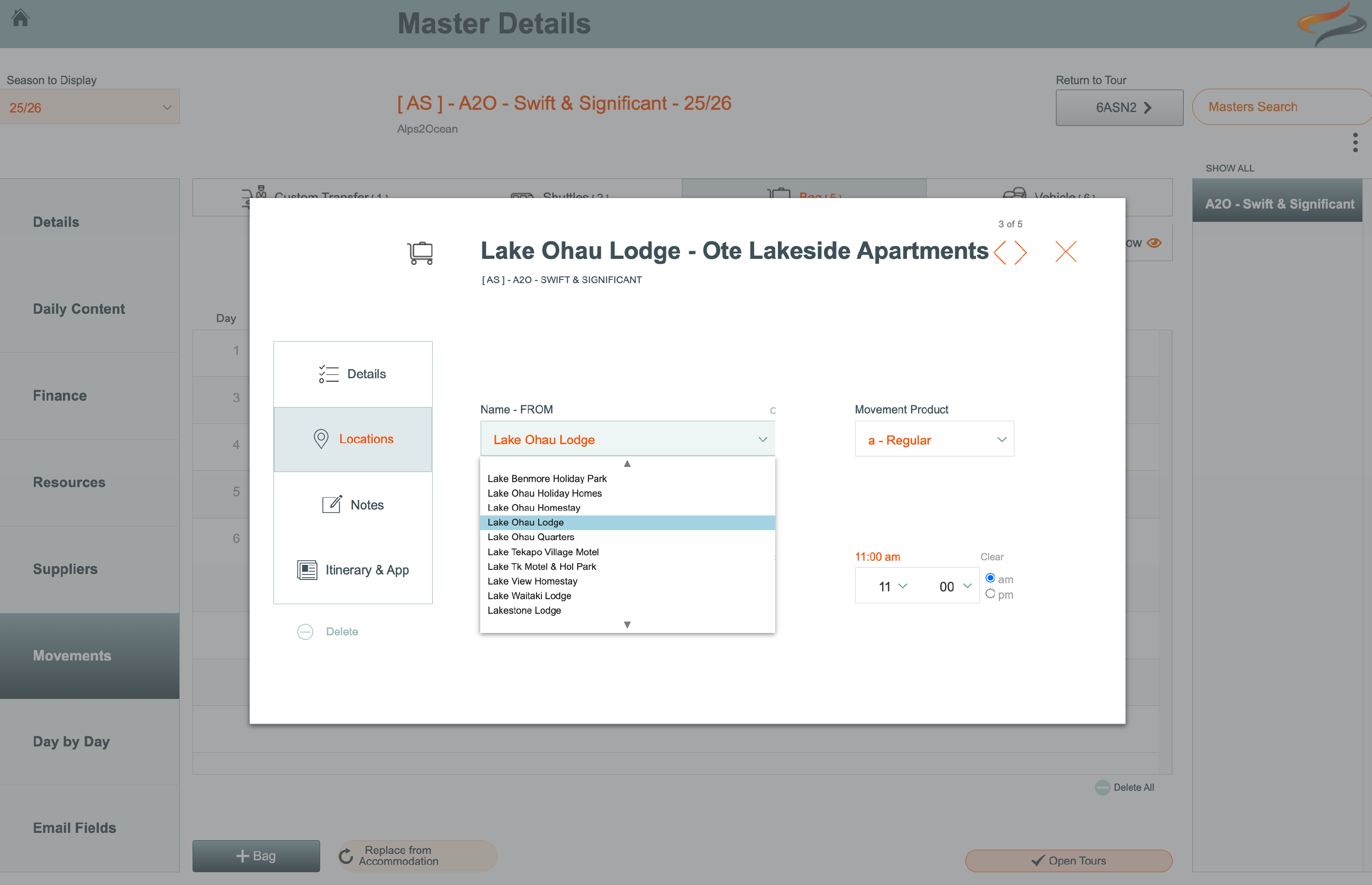The Master Movements settings control all the Movements which are standard on any Departures or Bookings based on this Master. Movements can be added or deleted at the Departure, or Client level.