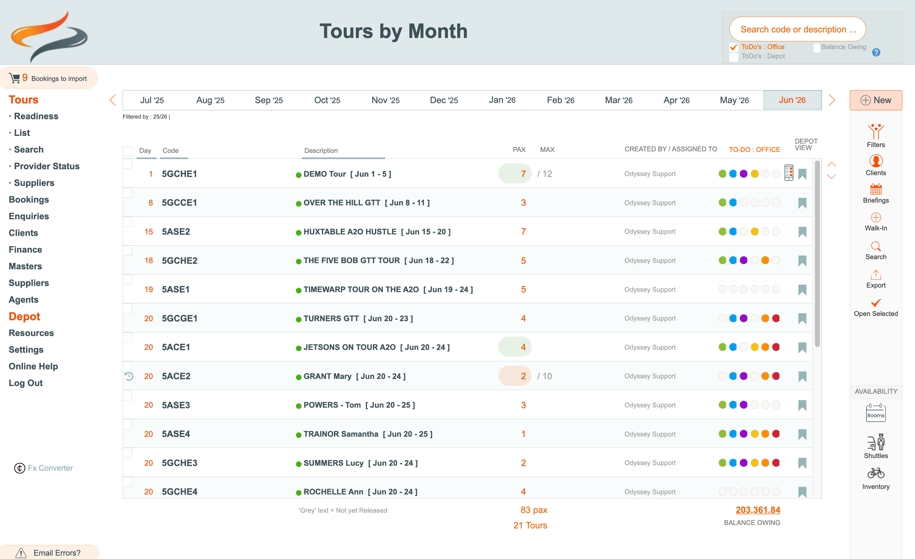 The Departure Dashboard is a list of the currently selected season's Departures, listed by month. Reservations level users, and Depot level users, have slightly different versions of it.