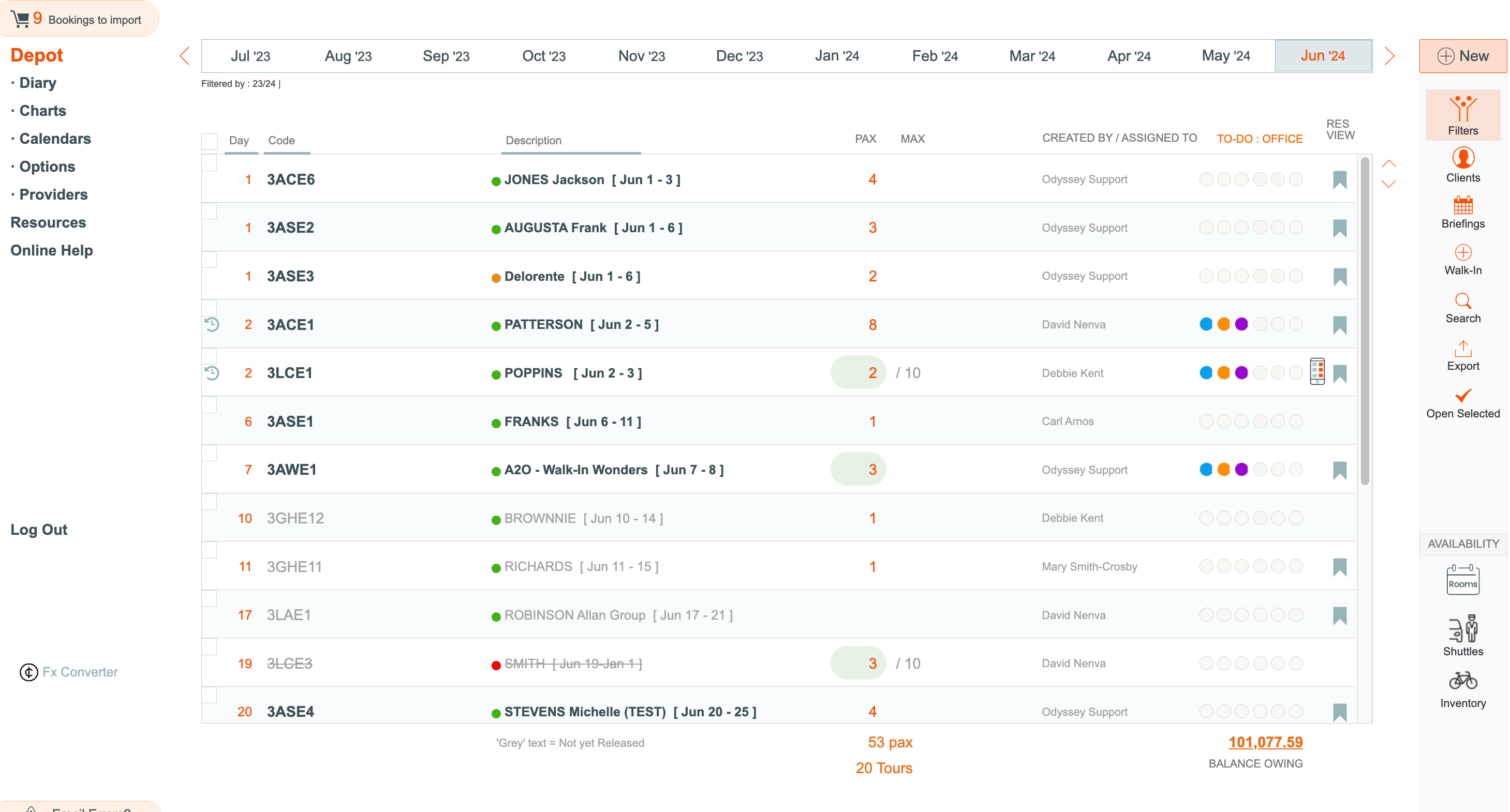 4. All the selected Departures have now opened, and you can then navigate to the tab required, e.g. to receipt payments, or send emails, or change itinerary information, and work through the selected set of departures by using either the SMALL < > arrows , or by clicking directly onto the next departure in the list on the left hand panel.