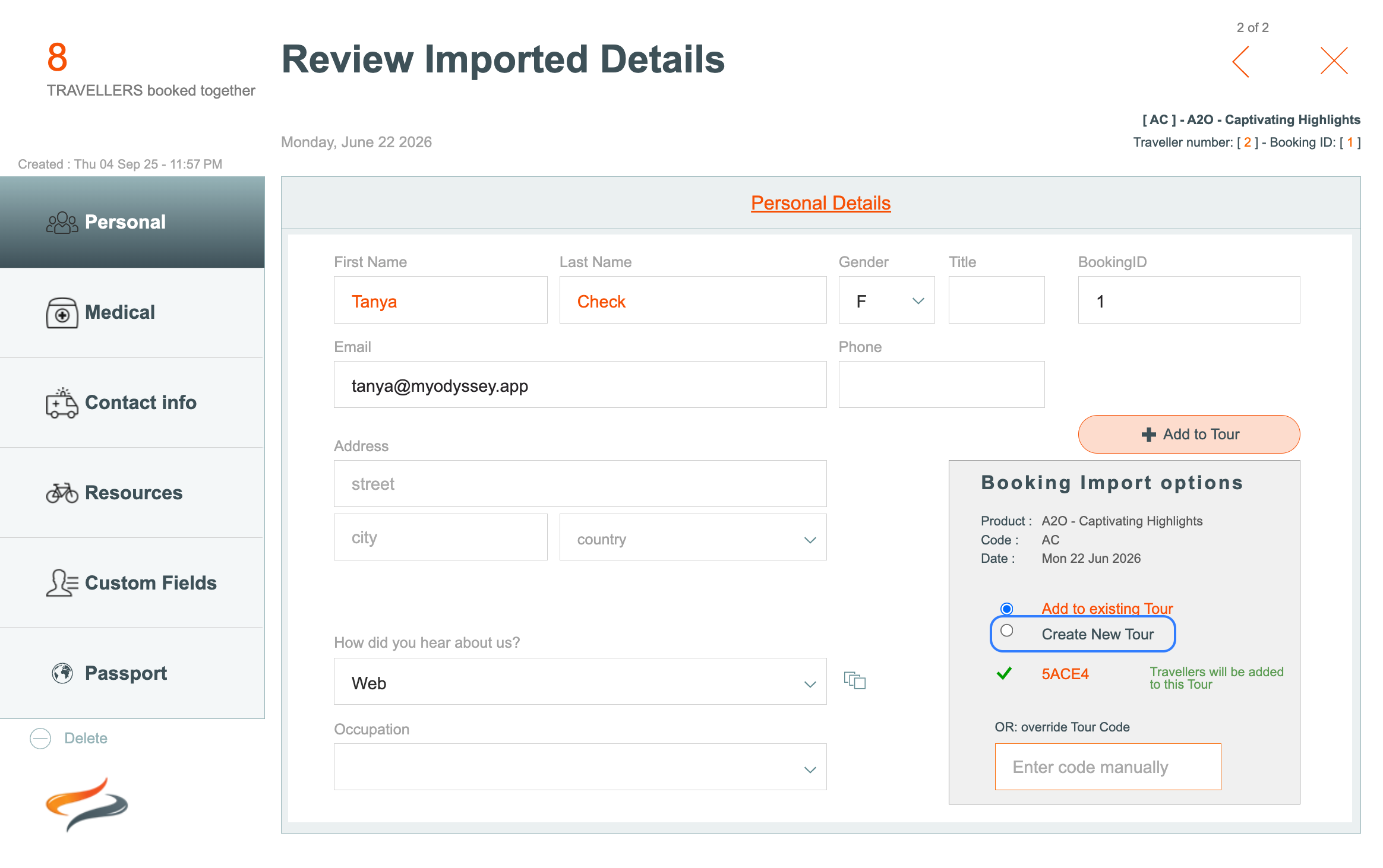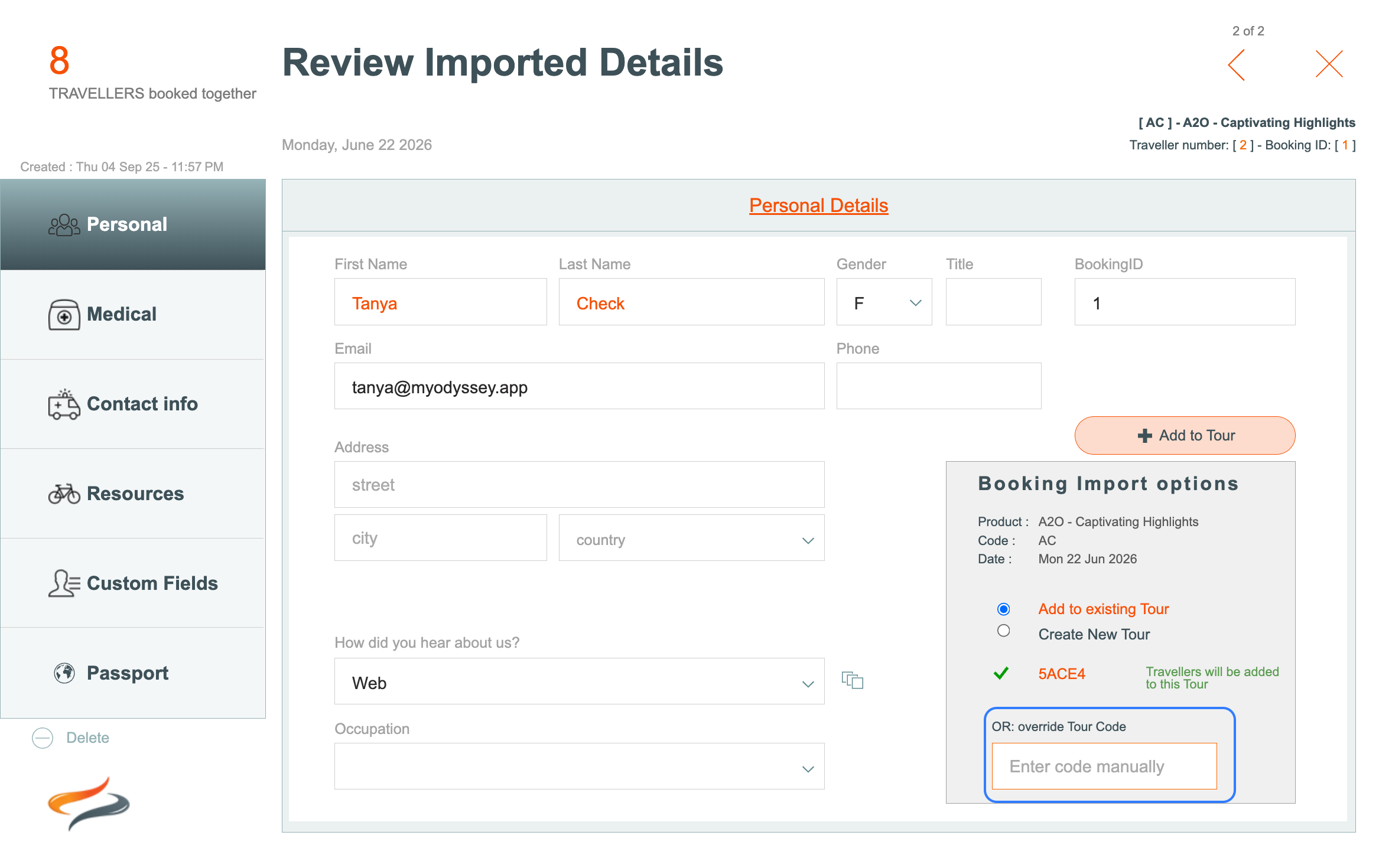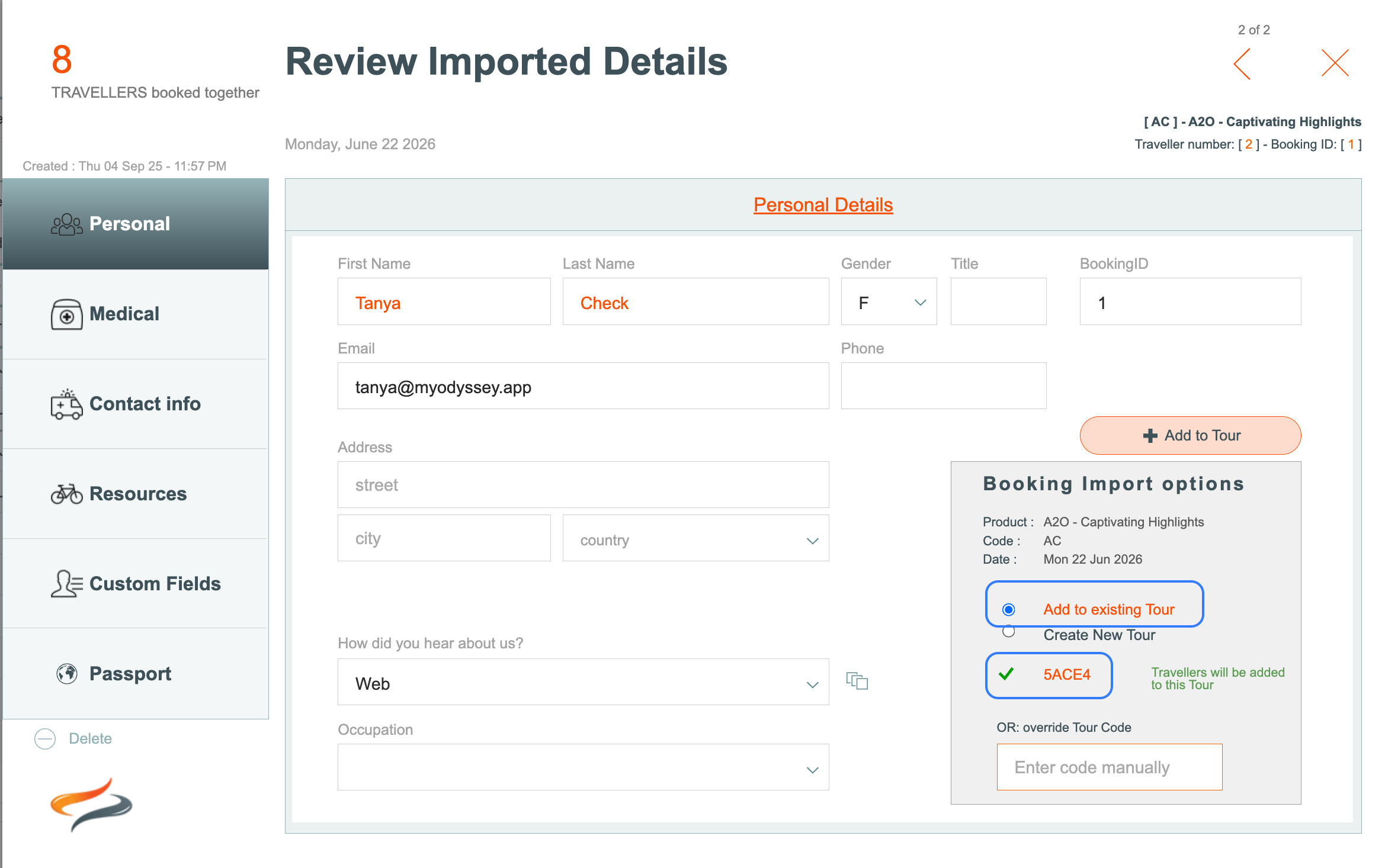 Stage 2 - Adding an imported booking to a tour