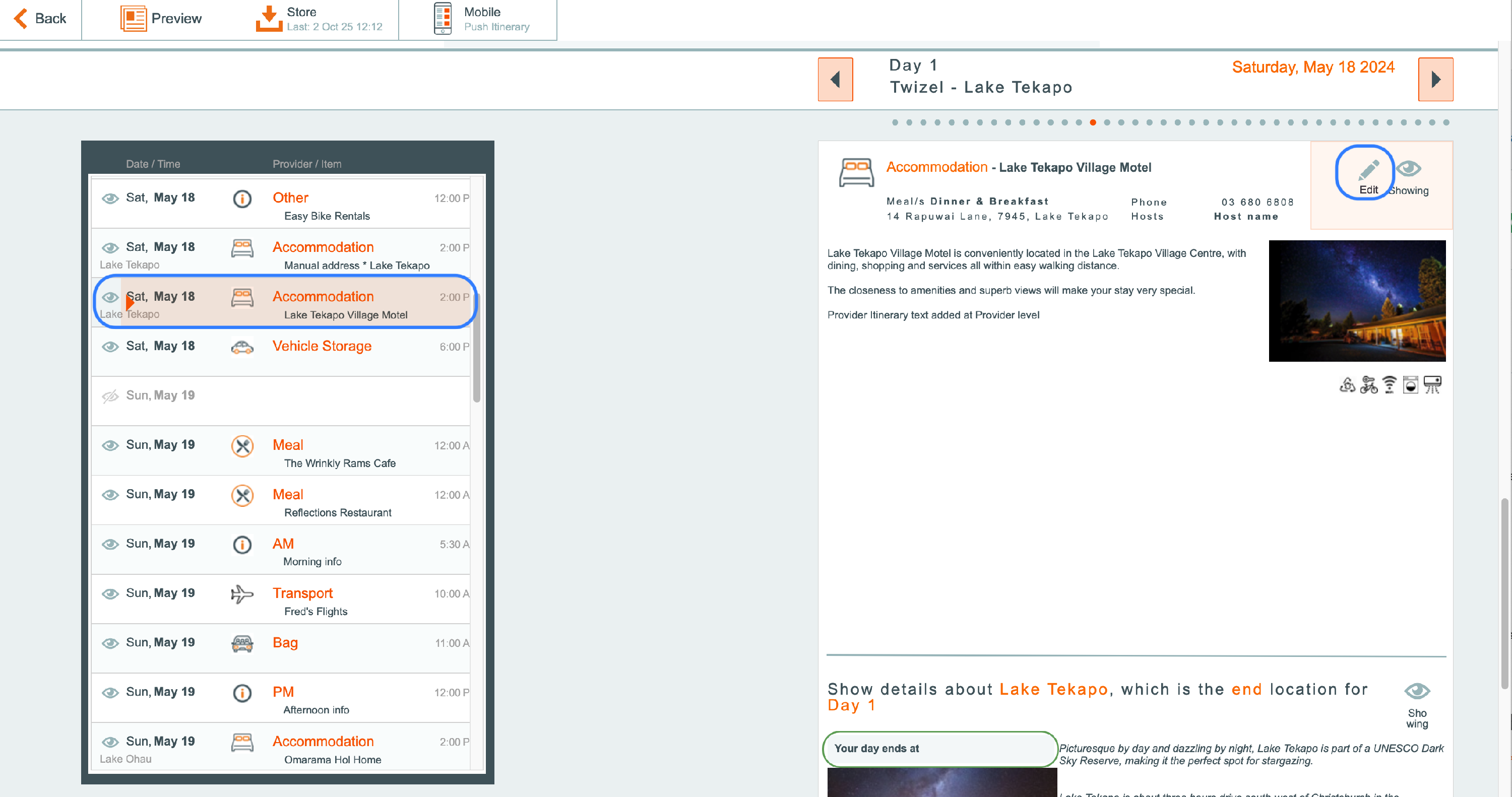 - the timeline is a scrollable list of each record in the carousel. If an item turned on, it will be listed in orange, if it's turned off, it will be in grey, and the show icon will be struck out. Each night's accommodation will also display the end of day daily location, to help you navigate your way.