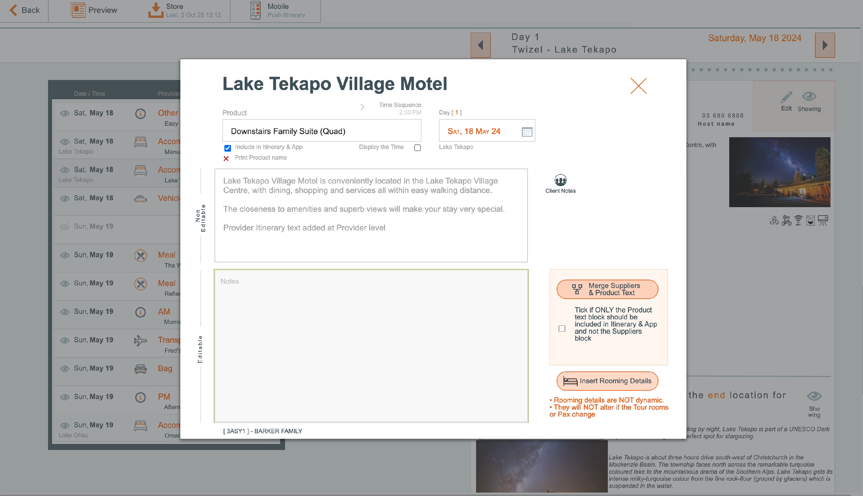 - In addition, the Provider PRODUCT text box can have the Rooming Details for this tour inserted in. This text is then editable, so that Guide accommodation, for example, can be edited out. Please note that these Rooming Details are not dynamic, i.e. if the provider records get changed at tour level, the user will need to come back to the inserted text here in the carousel view, and edit it. Note that this Rooming Details text can also be inserted into the Itinerary's Provider product field, at Tour level.