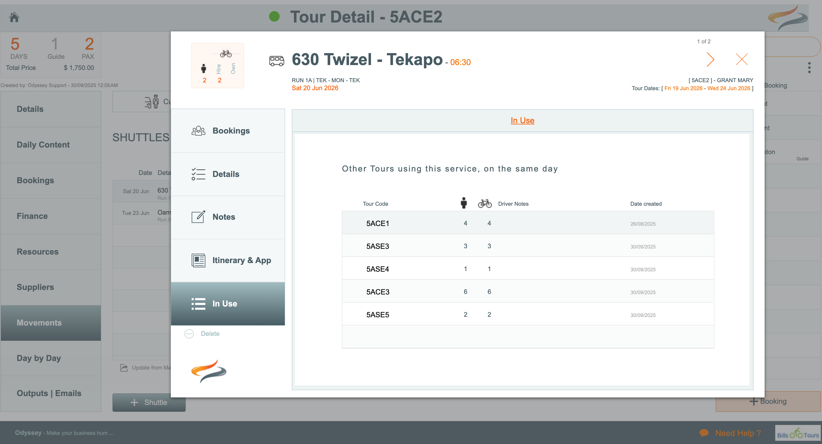 If there are other bookings on this shuttle, an extra tab appears on the shuttle movement window. This is the "In Use" tab. (If there is not a 'match' for the Run/Sector/Date/Time... this tab is not available).