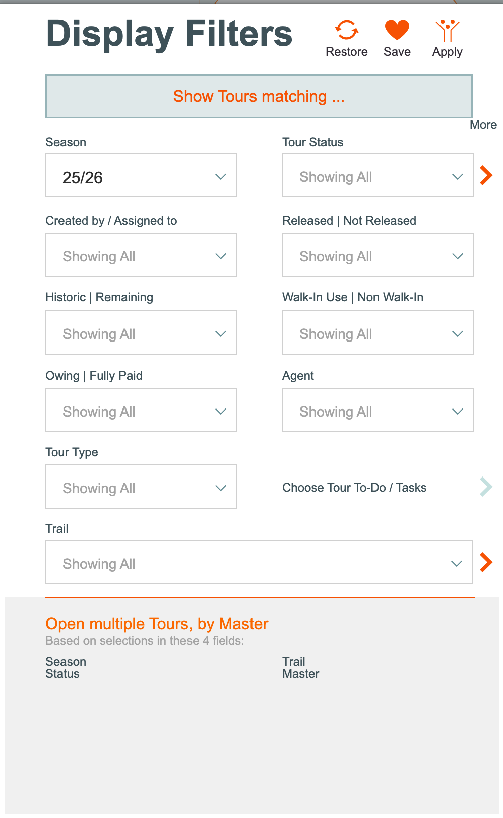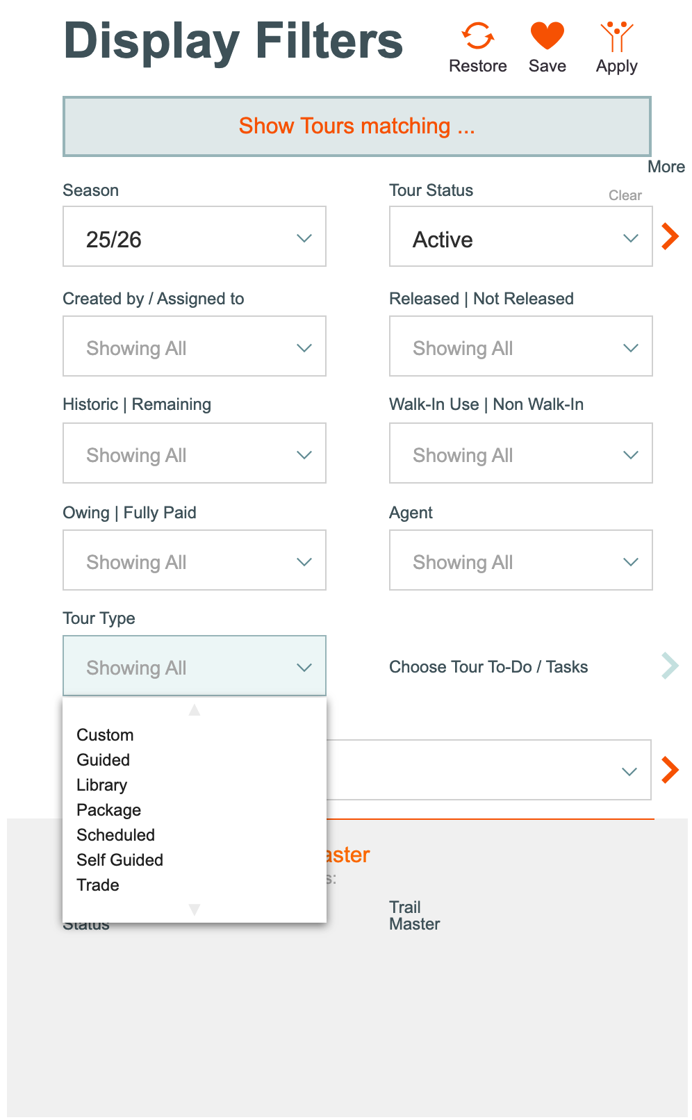 Note that the Tour status of 'Archive' does not show in this view. For more filtering options on Tour Status, click on the orange > arrow beside Tour Status. See the note and image in 2. below.