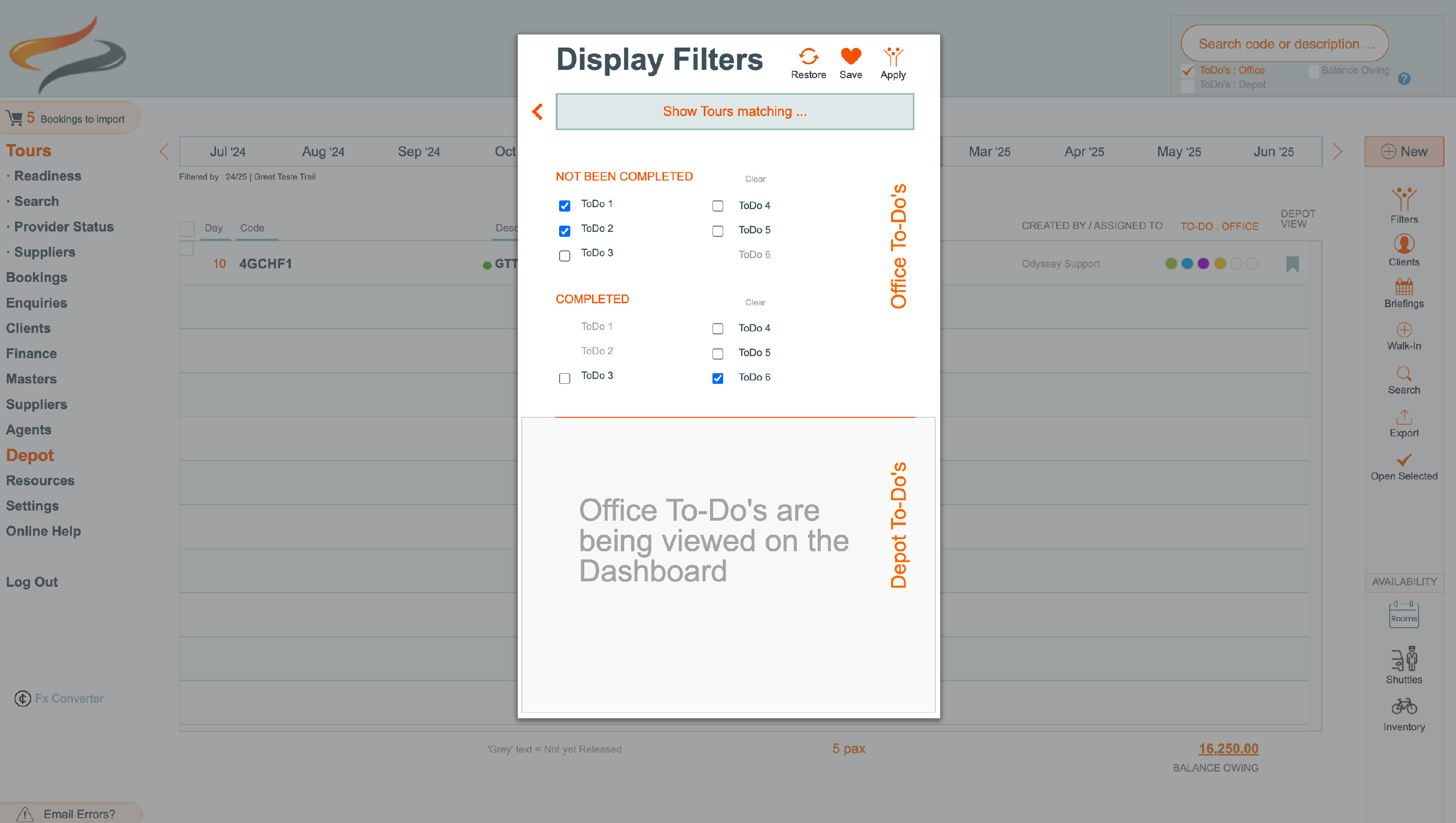 Filters can refine your Dashboard view to only display the Tours/Departures you seek with matching To-Do values.