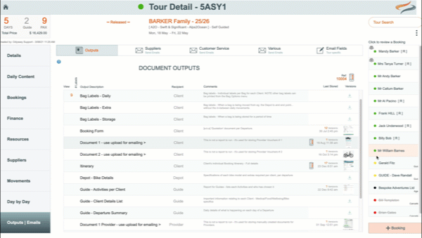 Designed for Internal or Guide use, the Client Sheet details the majority of booking selections made by each client, including their Contact details, start and end date of trip, group type, Daily Movements, Daily Locations and Accommodation providers, Resources, Providers and Booking status, Transfers, etc.