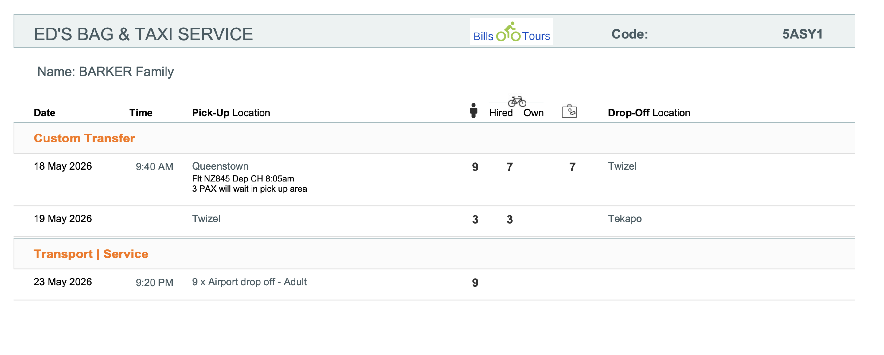 Custom Shuttle /Transfer - Drivers Manifest