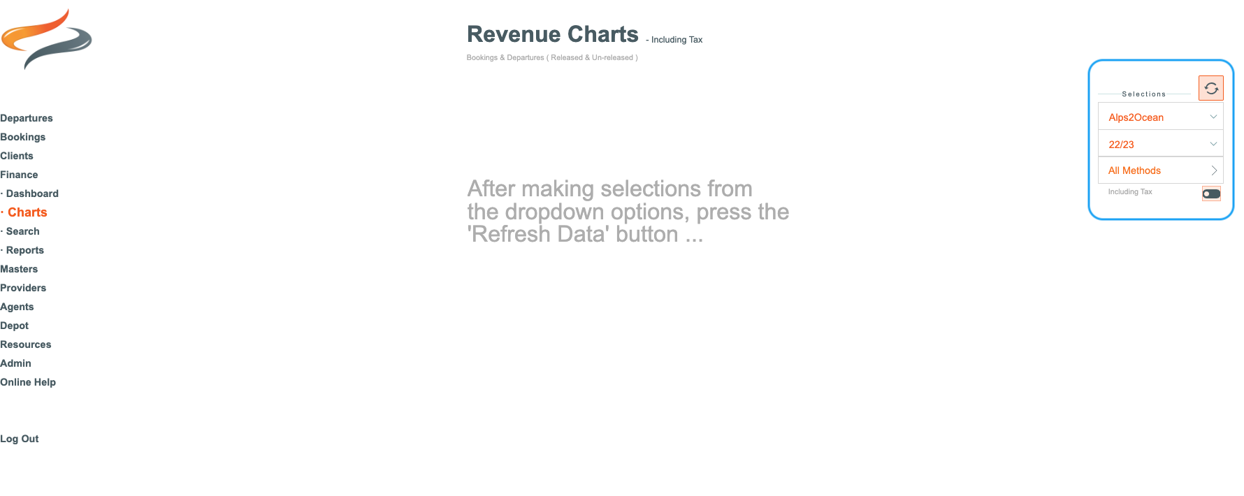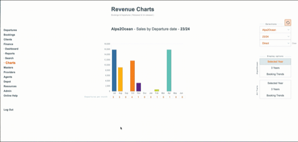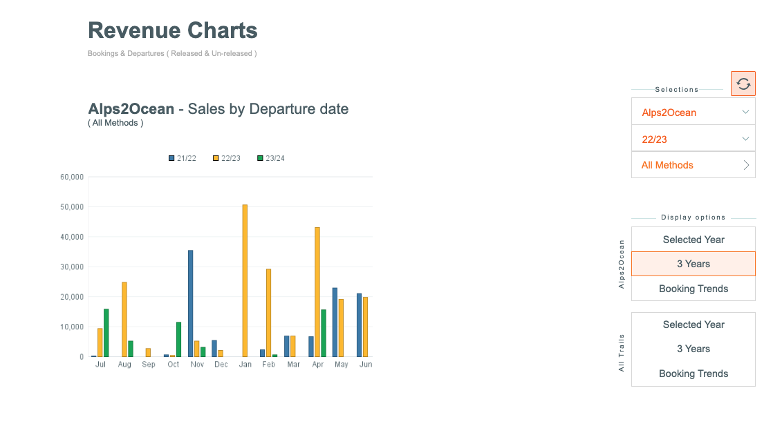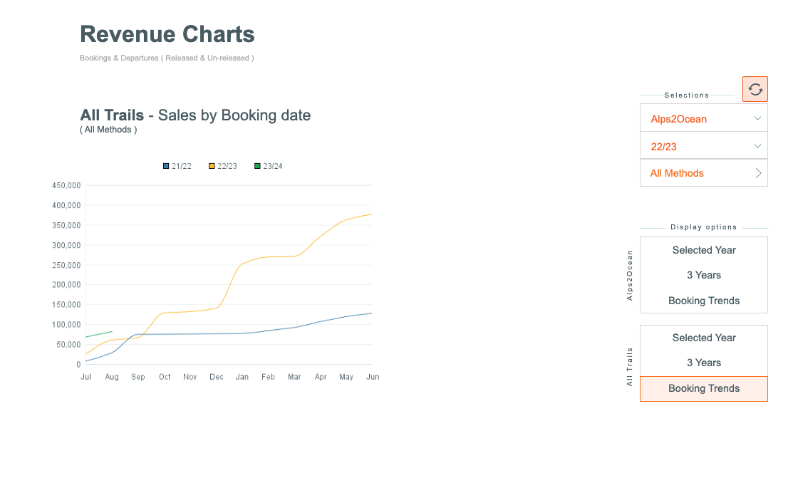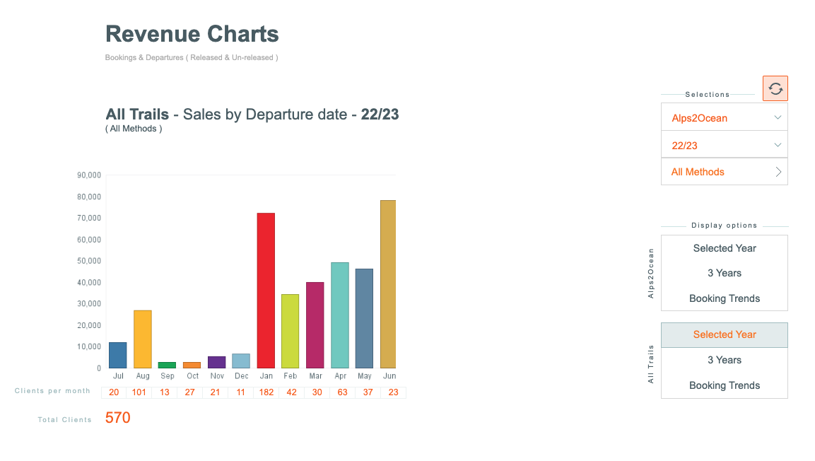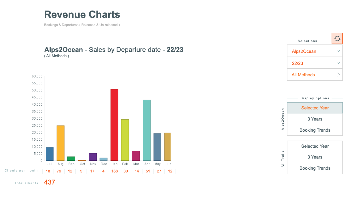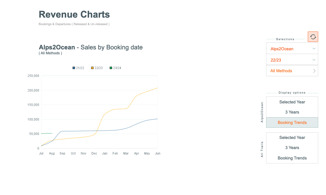 There are display controls for displaying Revenue, based on the season/s, Trail (inc All Trails option), Method of Booking... so you can filter out and view the sales from Agents, Direct, Operator etc. (and combinations of these)