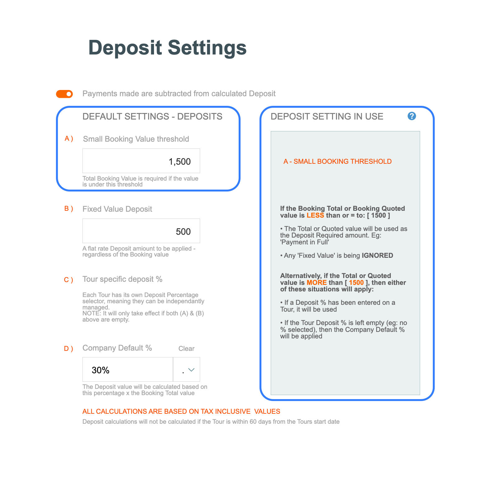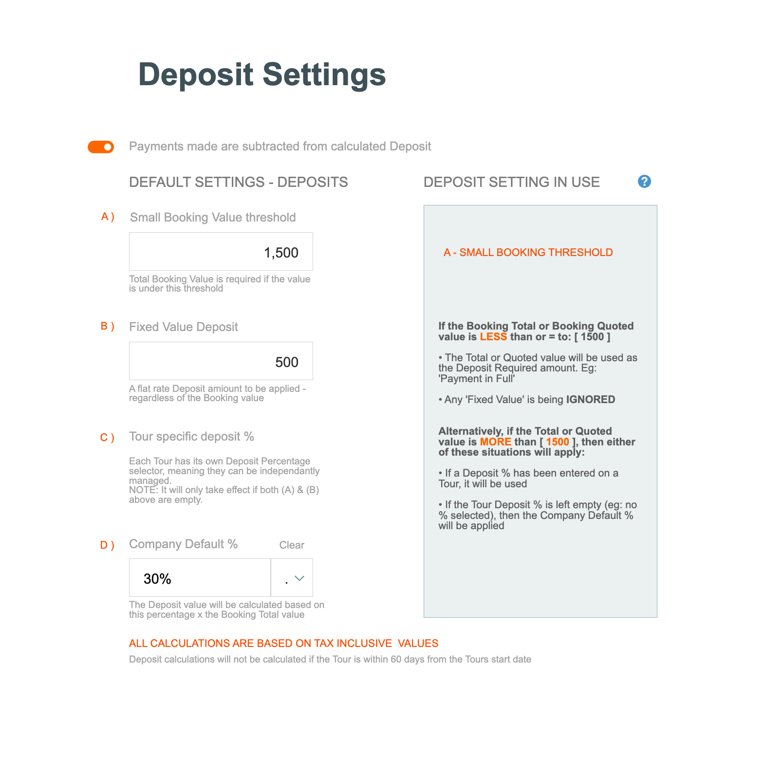 There are a range of Deposit settings to suit every possible requirement, and are based on a Booking (Client) Total, or Booking (Client) Quoted value