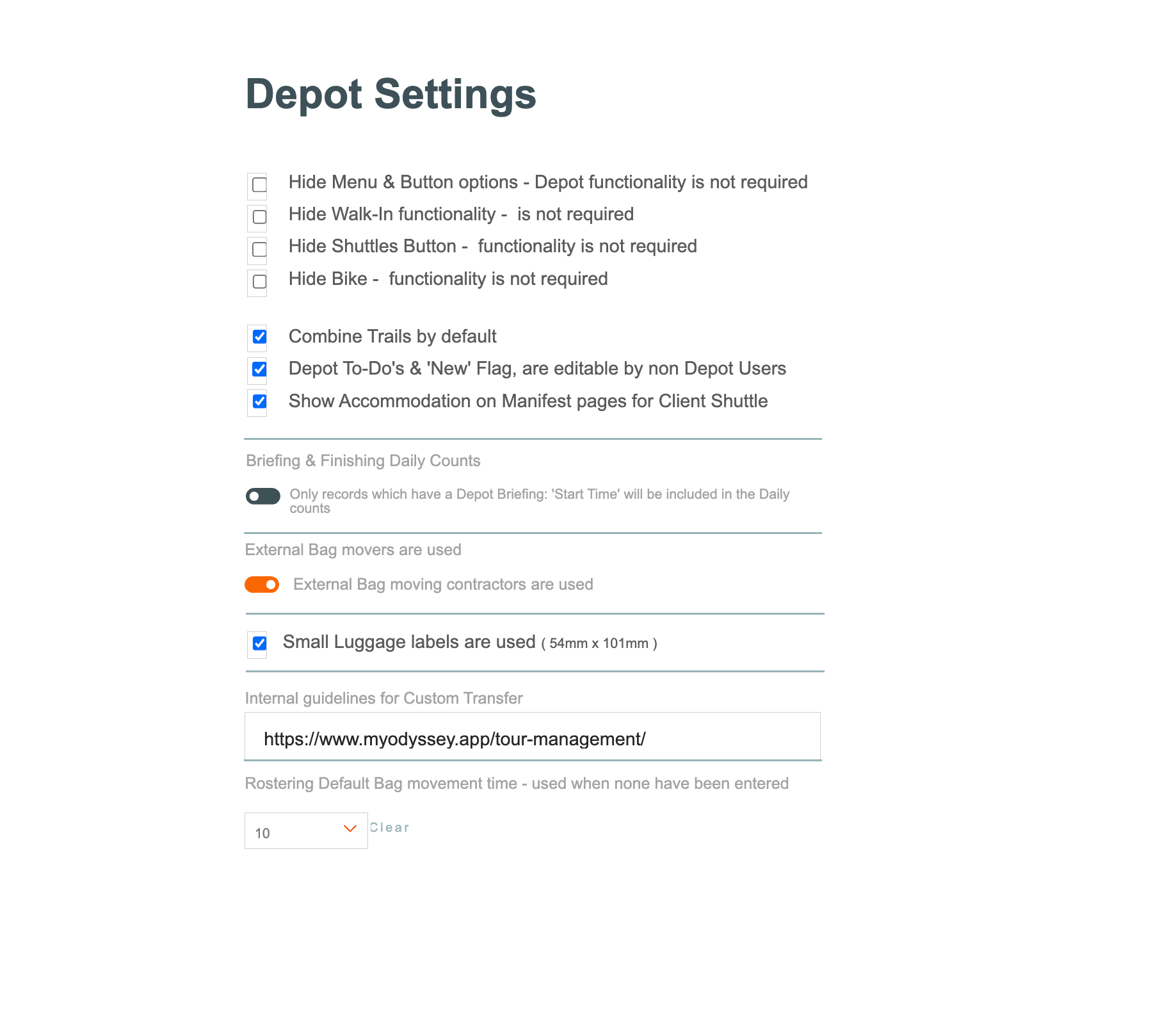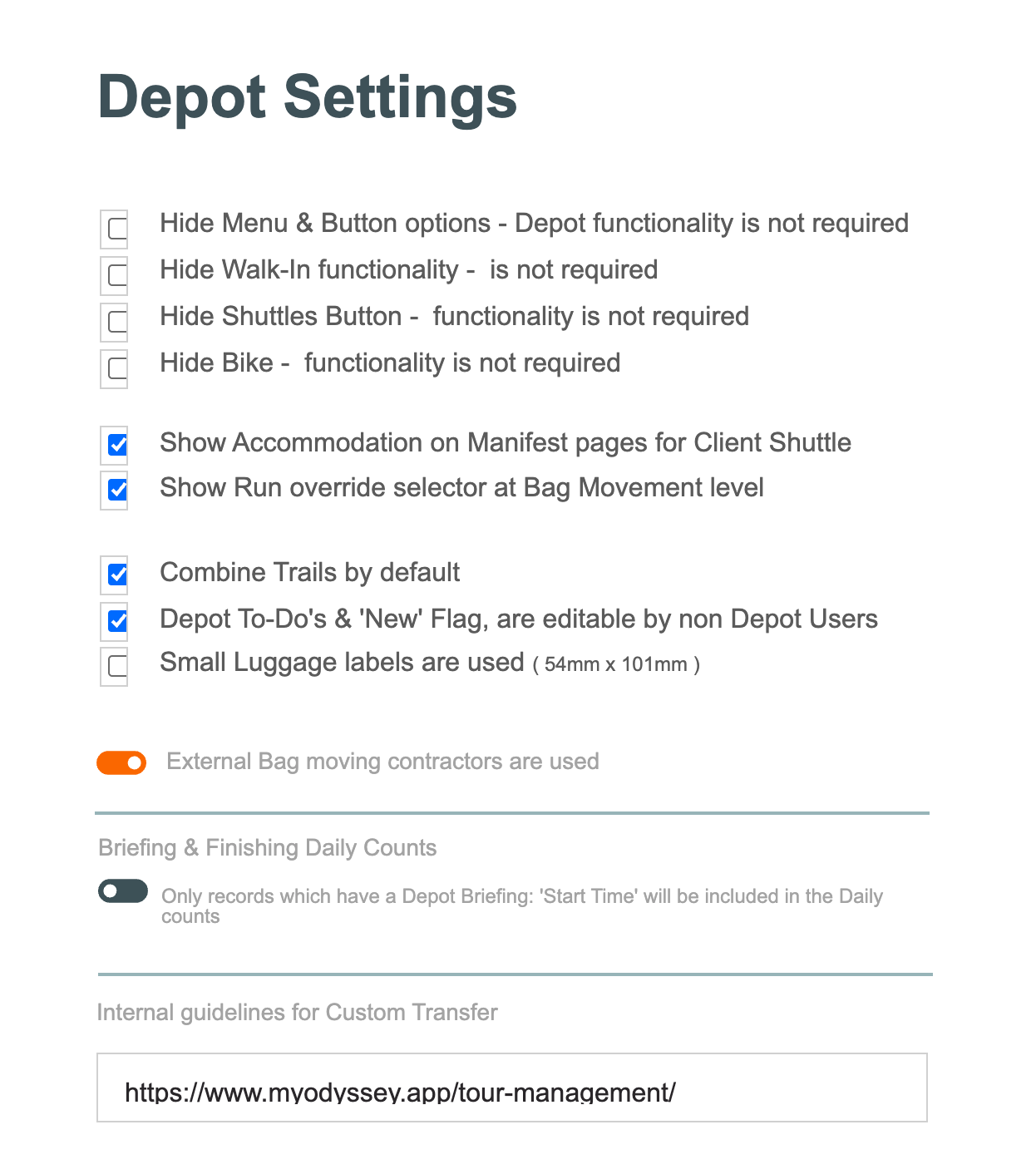 Not all of our clients use Depot Functionality. Tick in any of these tick boxes to disable the functionality if it isn't required: