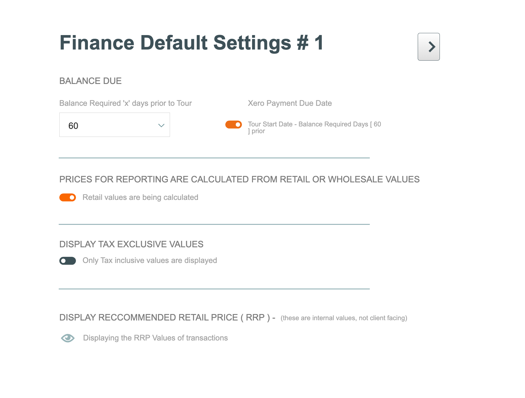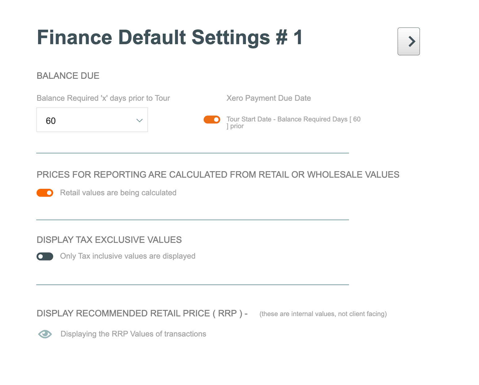 For Odyssey clients using the Advanced module of Xero Integration, slide the slider to orange to indicate that the Tour start date in Odyssey triggers the balance required (60 days) calculation in Xero