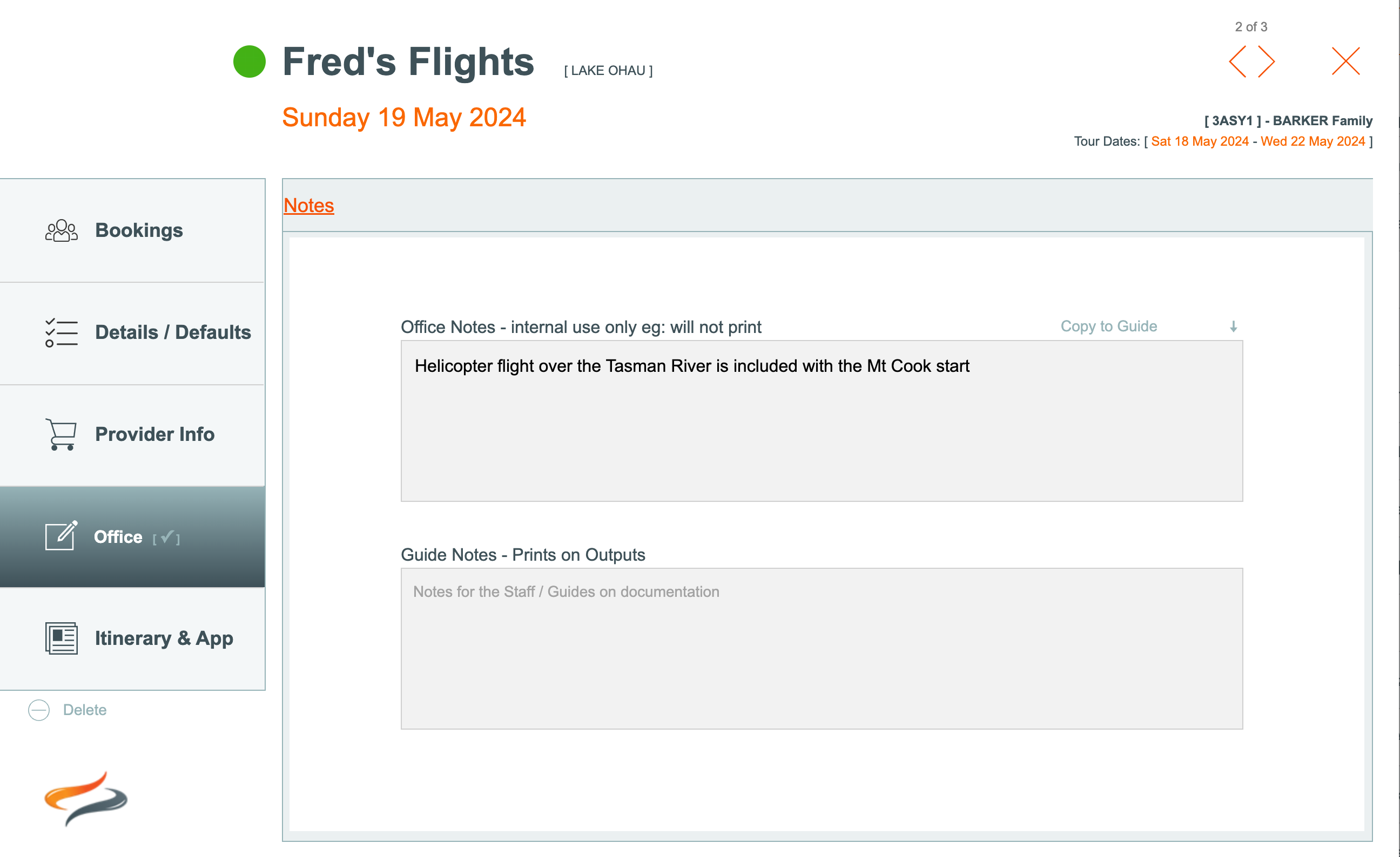 Notes for Office: Add any Office related notes about this Provider, in relation to this Tour. These notes can be pushed to the Guide notes, by clicking the button. These Notes show on the Tour | Provider | Allprovider tab. And are also visible on the Accommodation tab, by hovering over the pencil.