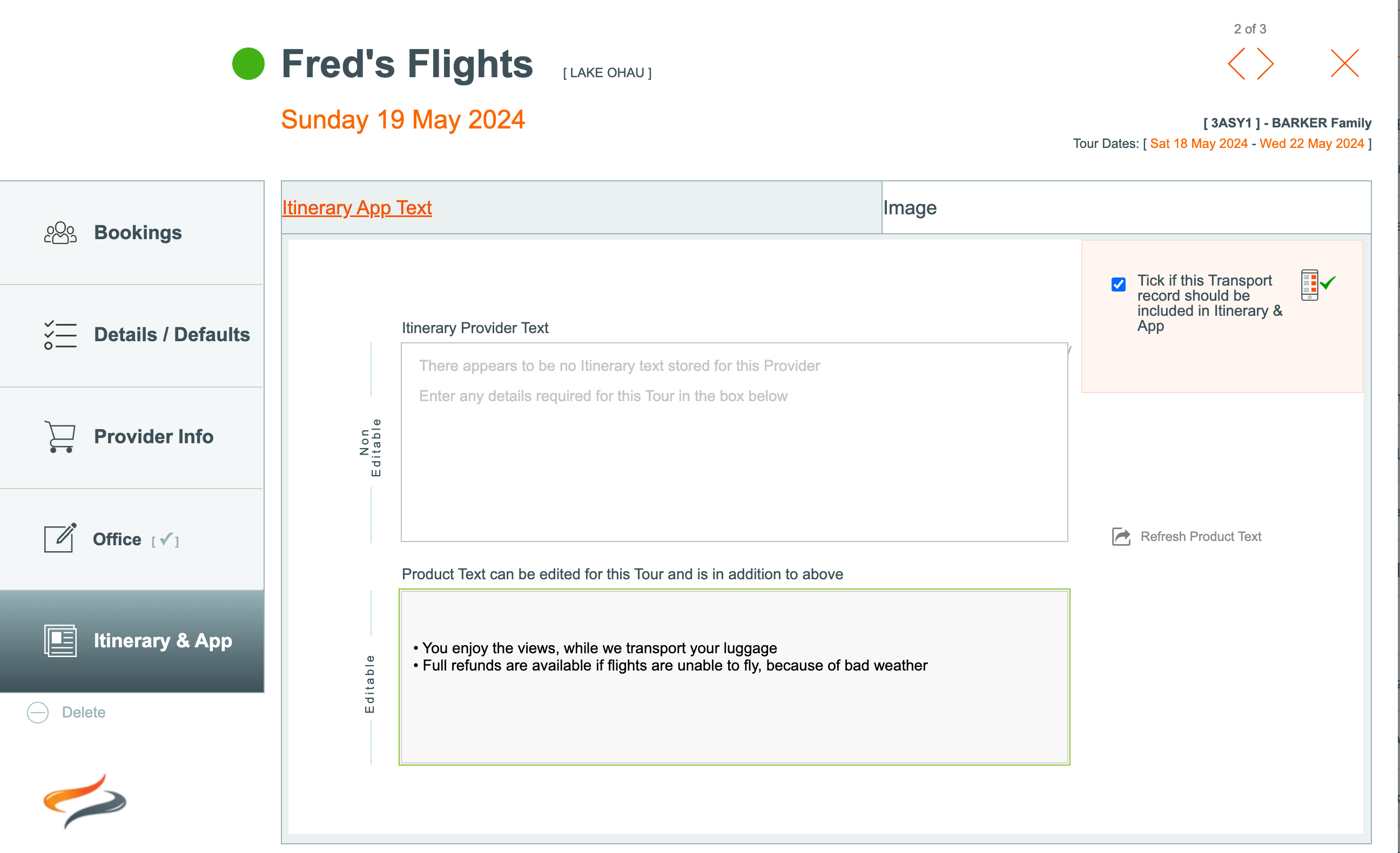 - a tickbox to indicate if this text should be displayed in the Itinerary or not. This can still be altered when creating the Itinerary.