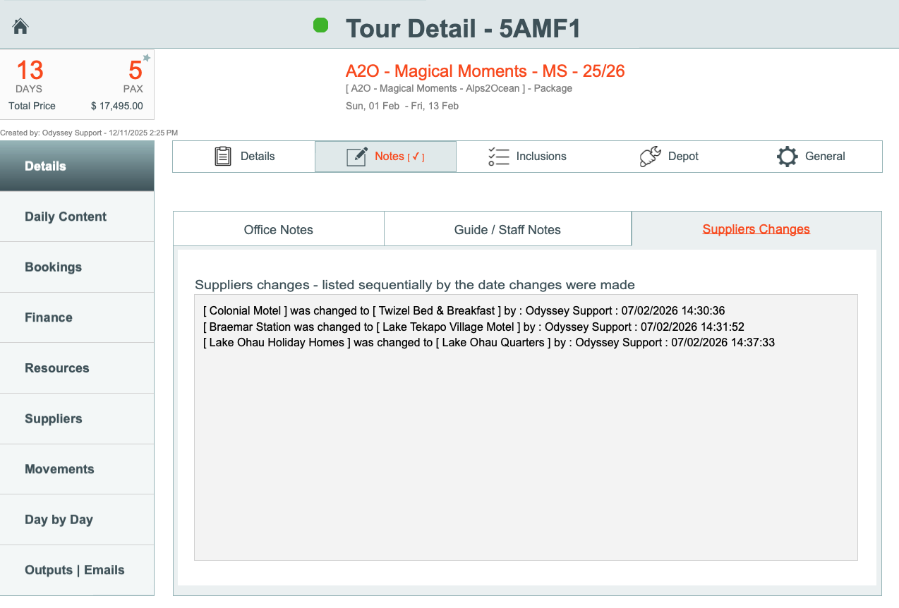 NOTE: If an accommodation provider has been changed, the Tour | Details | Notes | Suppliers Change tab will list sequentially any changes made, along with the name of the user who made the change, and the date and time the change was made.