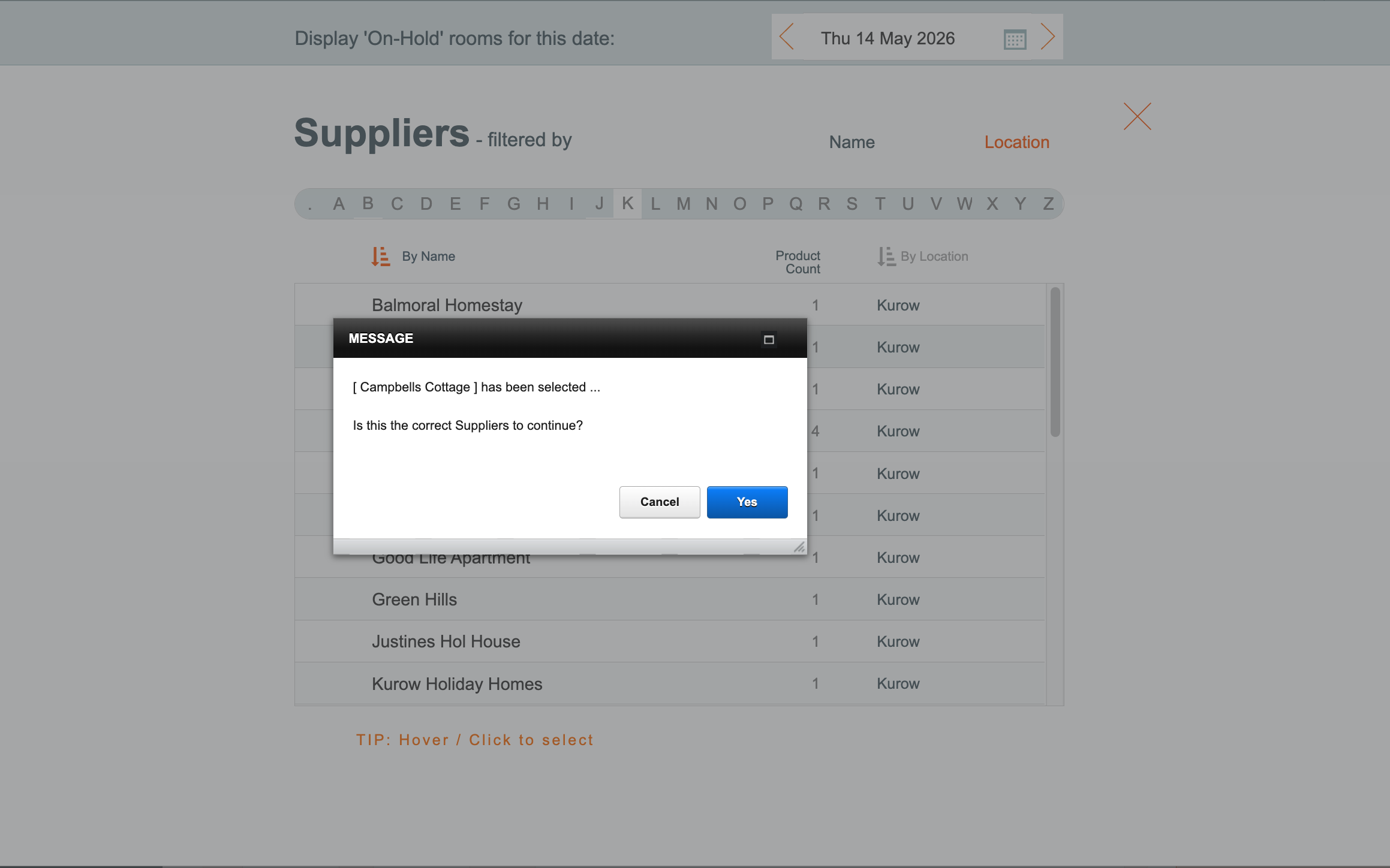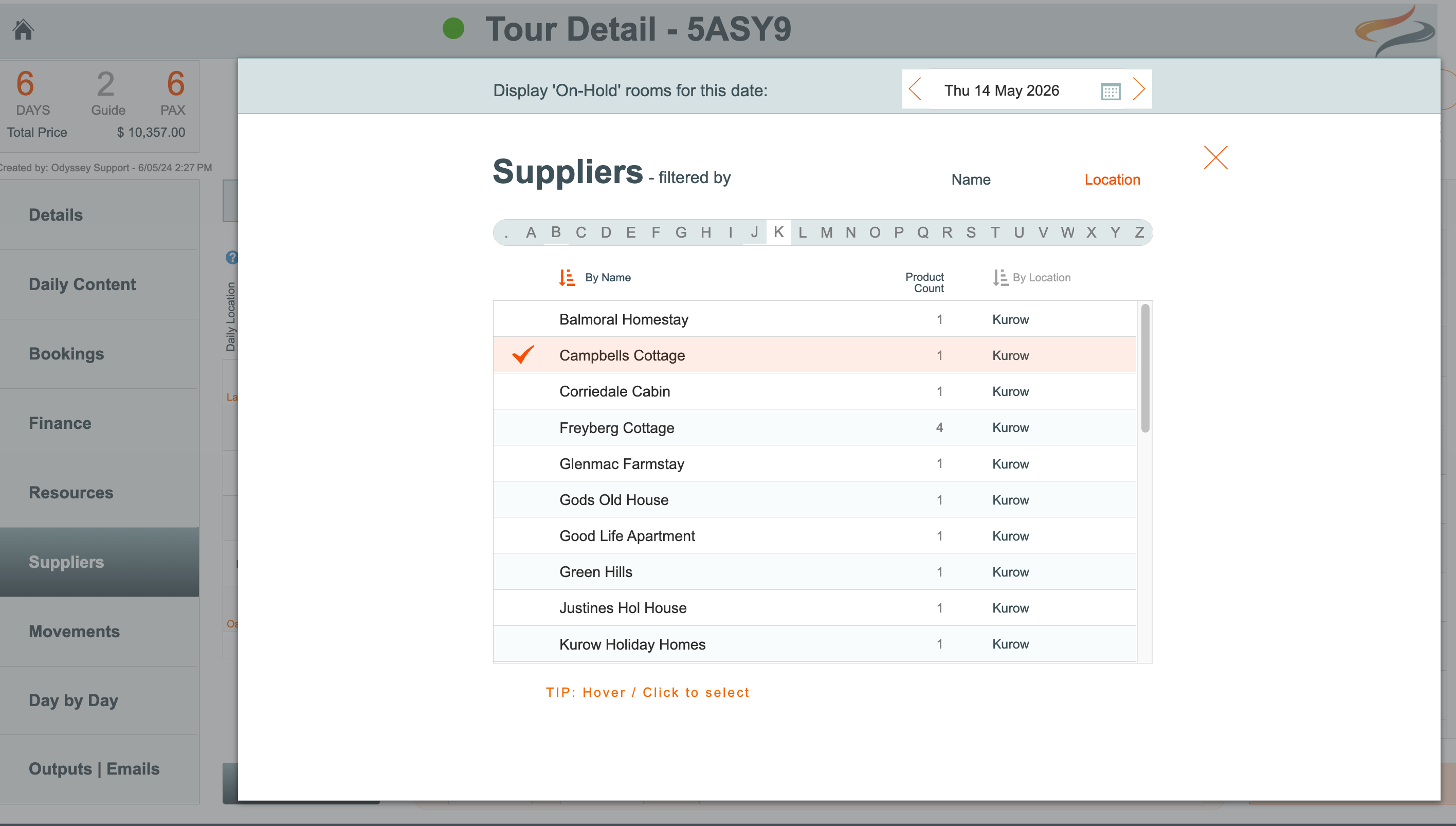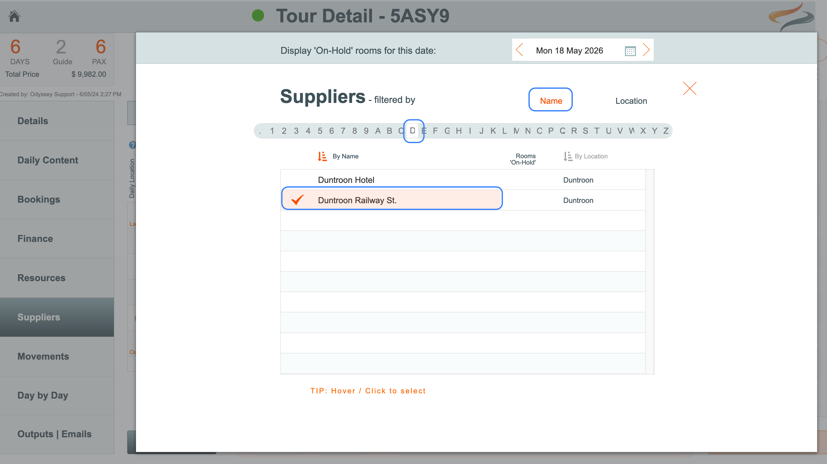- From the Main Menu | Tour | Provider/Supplier | Accommodation select the appropriate day from the list of Accommodation Providers ( or use the < > to navigate to it if you are inside the pop up menu already)