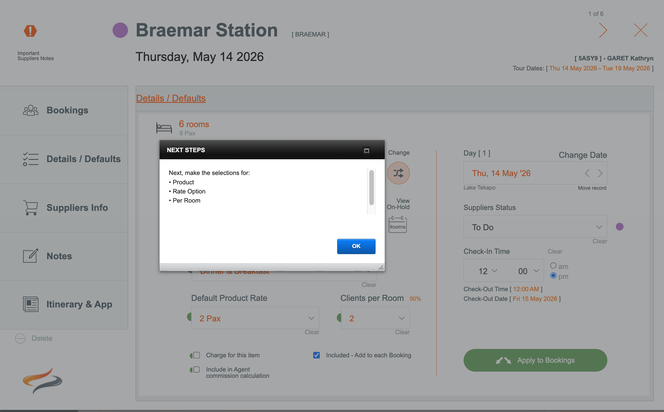 - You will then be reminded to make selections for Product, Rate and PAX Per room, Click OK