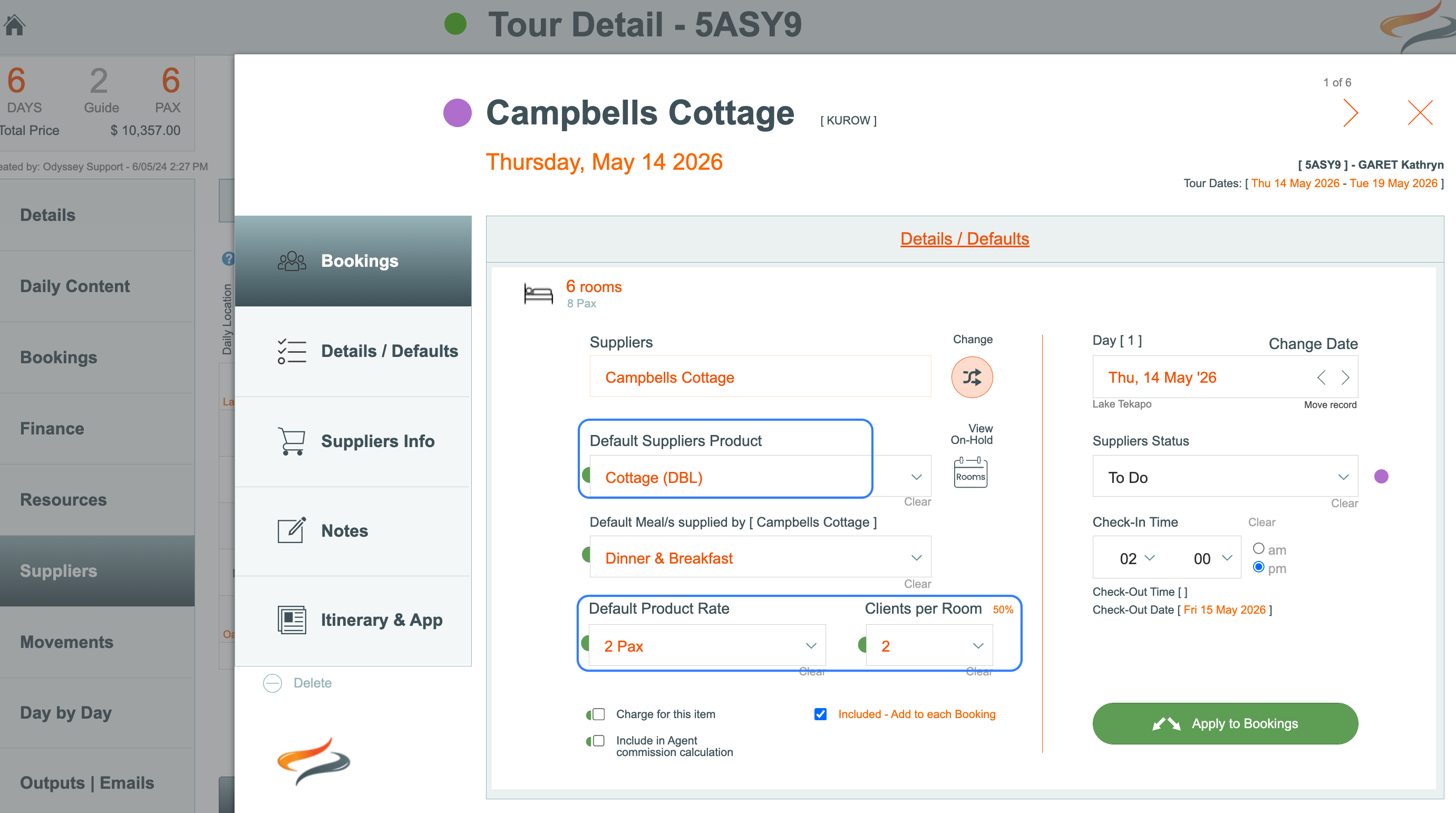 - Make the appropriate selections to Suppliers Product, Default Product Rate, and Clients per room