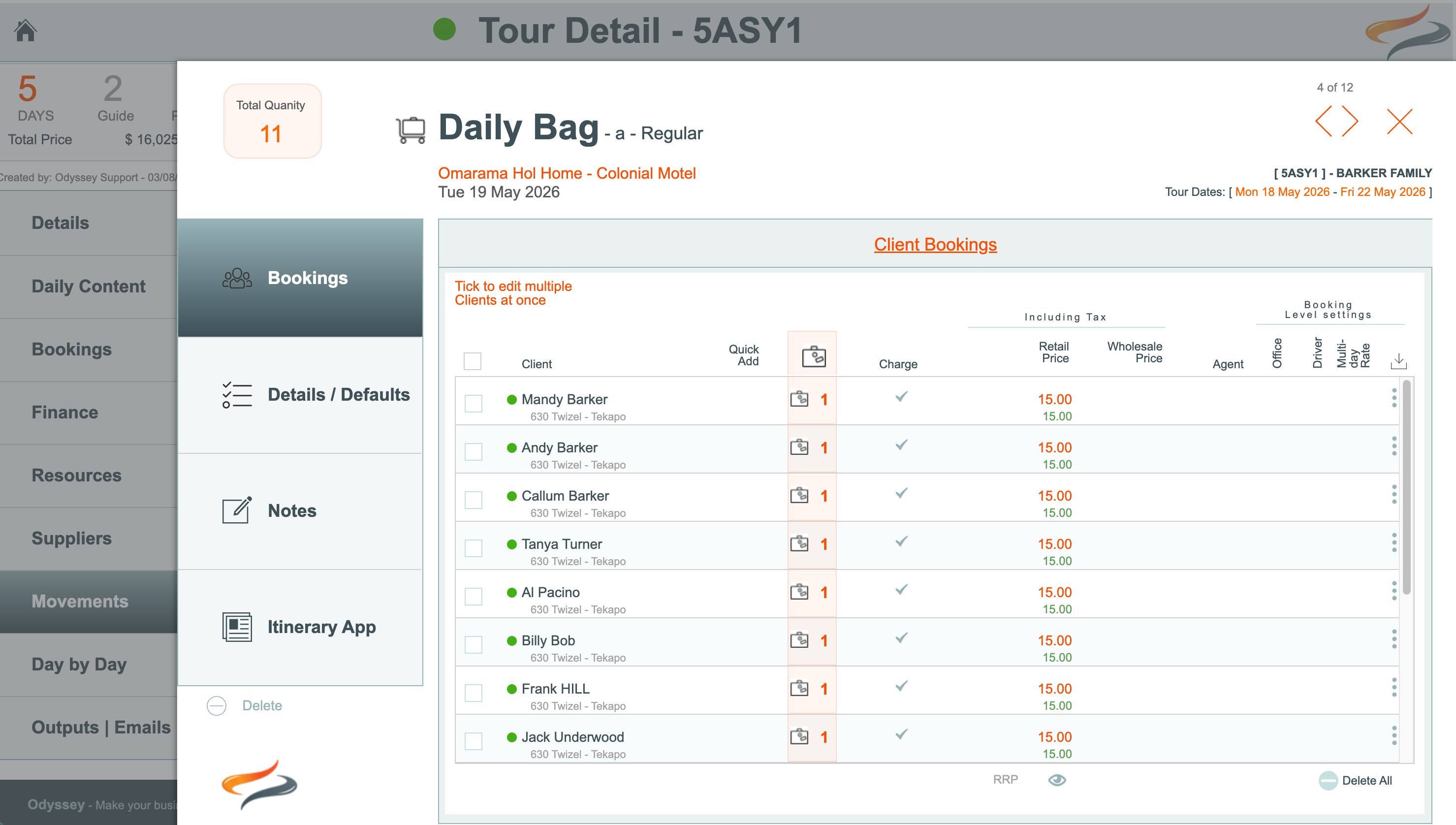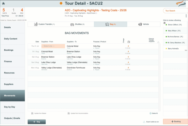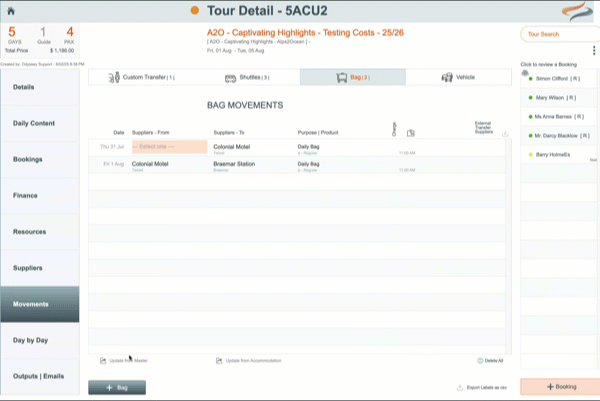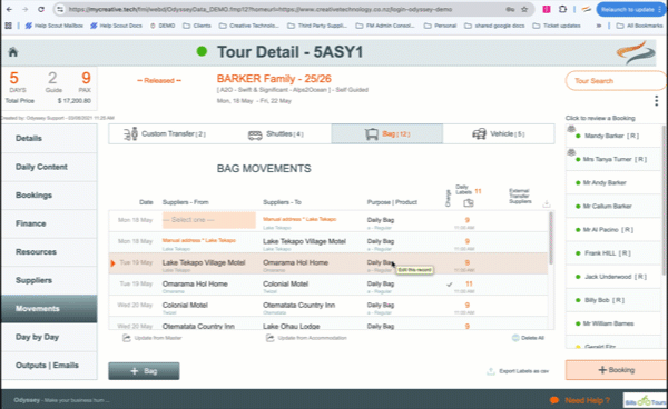 On the Tour's bag movement list, you will see a daily list of each planned bag movement, based on