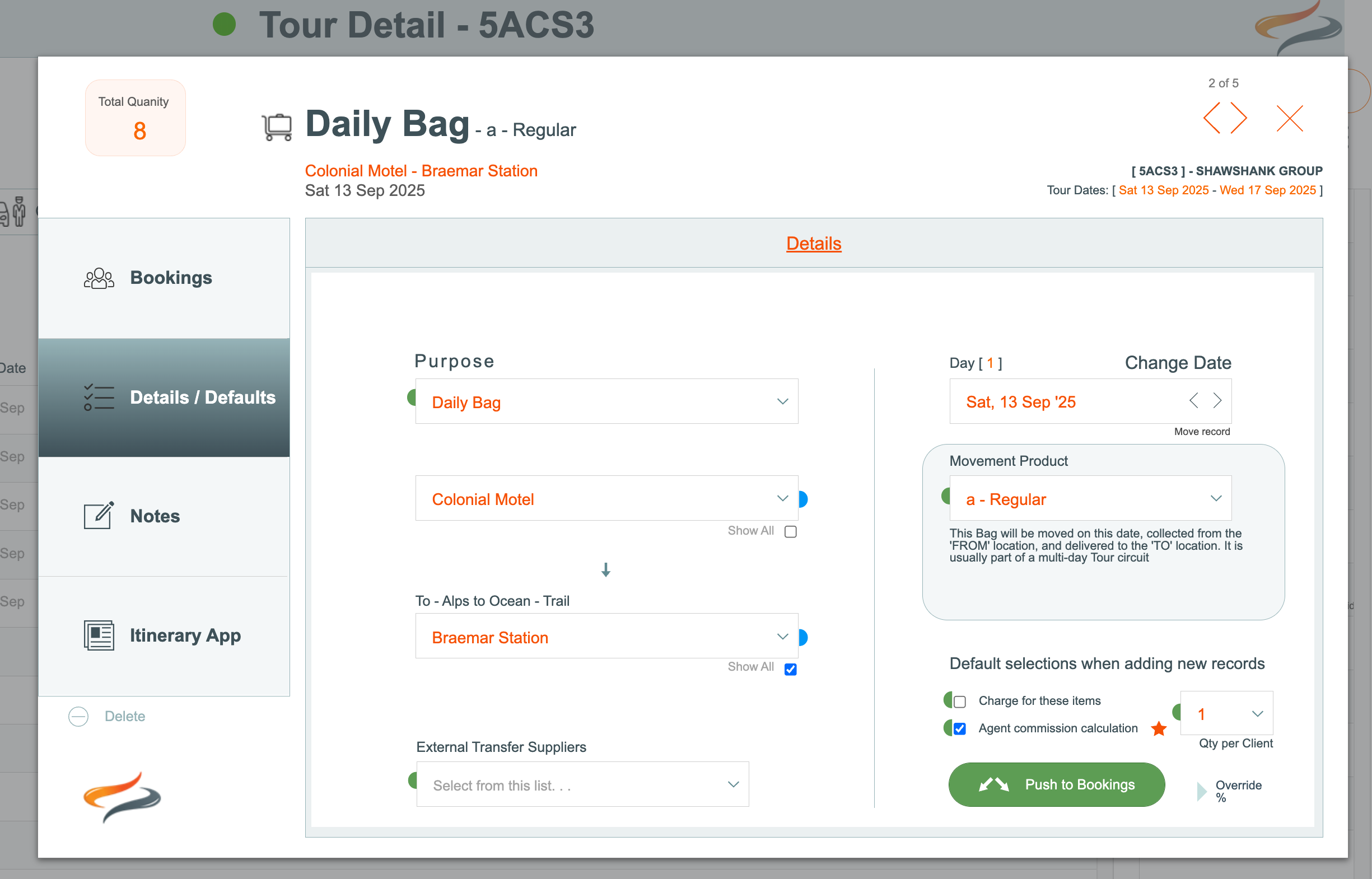 - Note: if an external bag mover has been added to the Master bag movement record, it will be pulled through to the Tour level bag movement on the applicable day/s