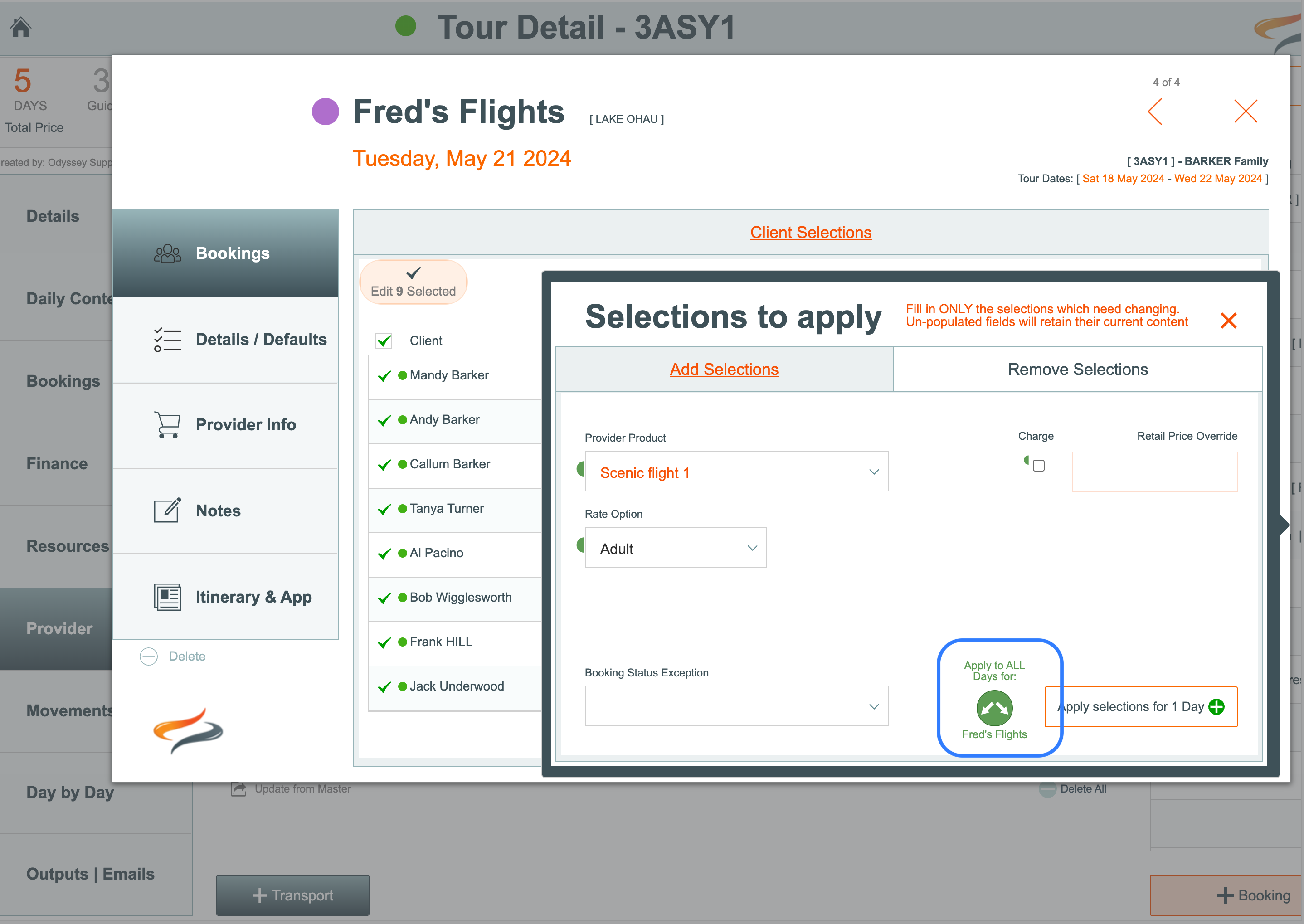 - Use the Apply to All Days button if you wish to push these changes through to every day of the tour, for this booking.