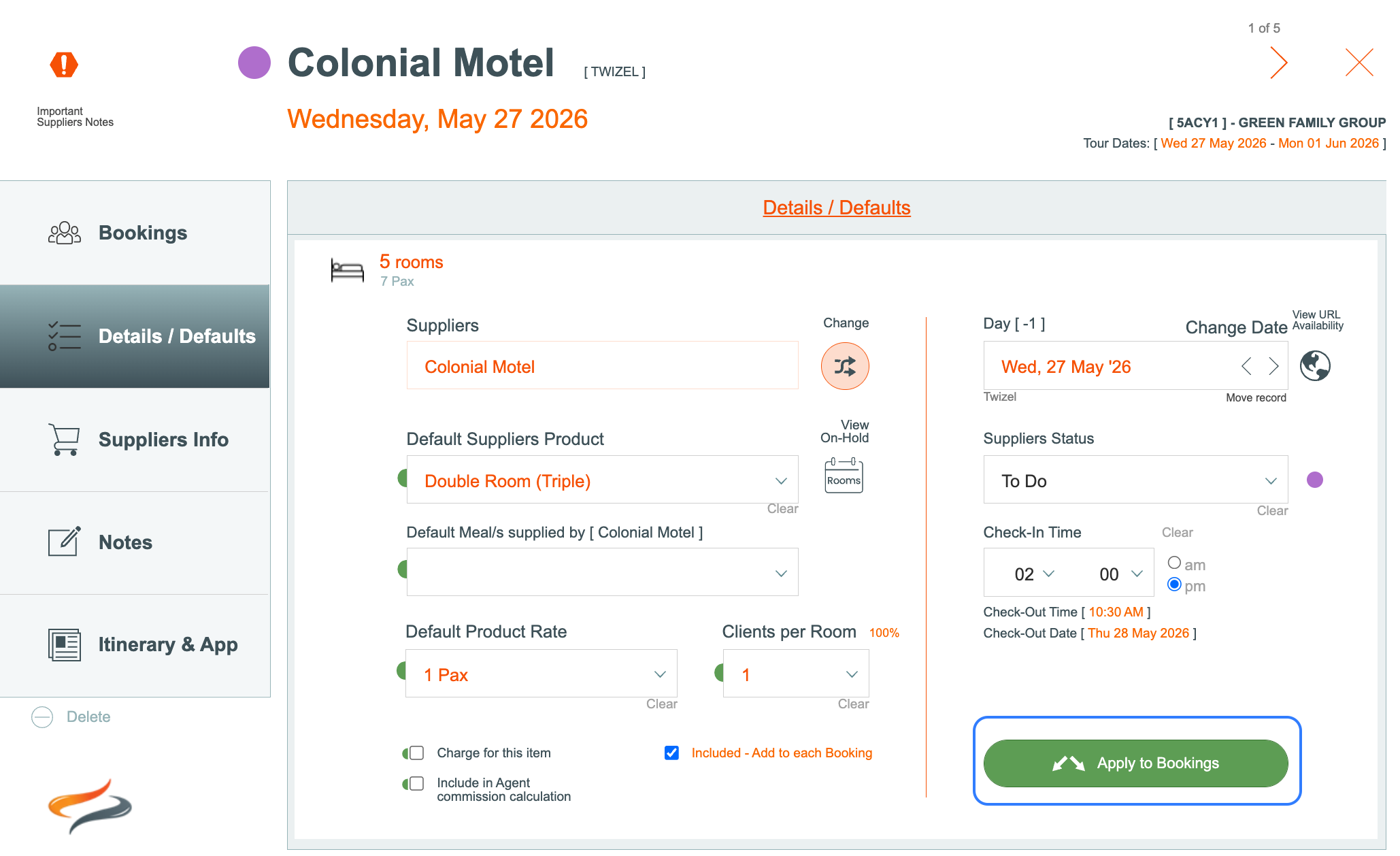 If you make changes to the settings on the Tour | Details|Defaults tab, and wish the changes to be made to the existing bookings on this tour, click the Apply to Bookings Button