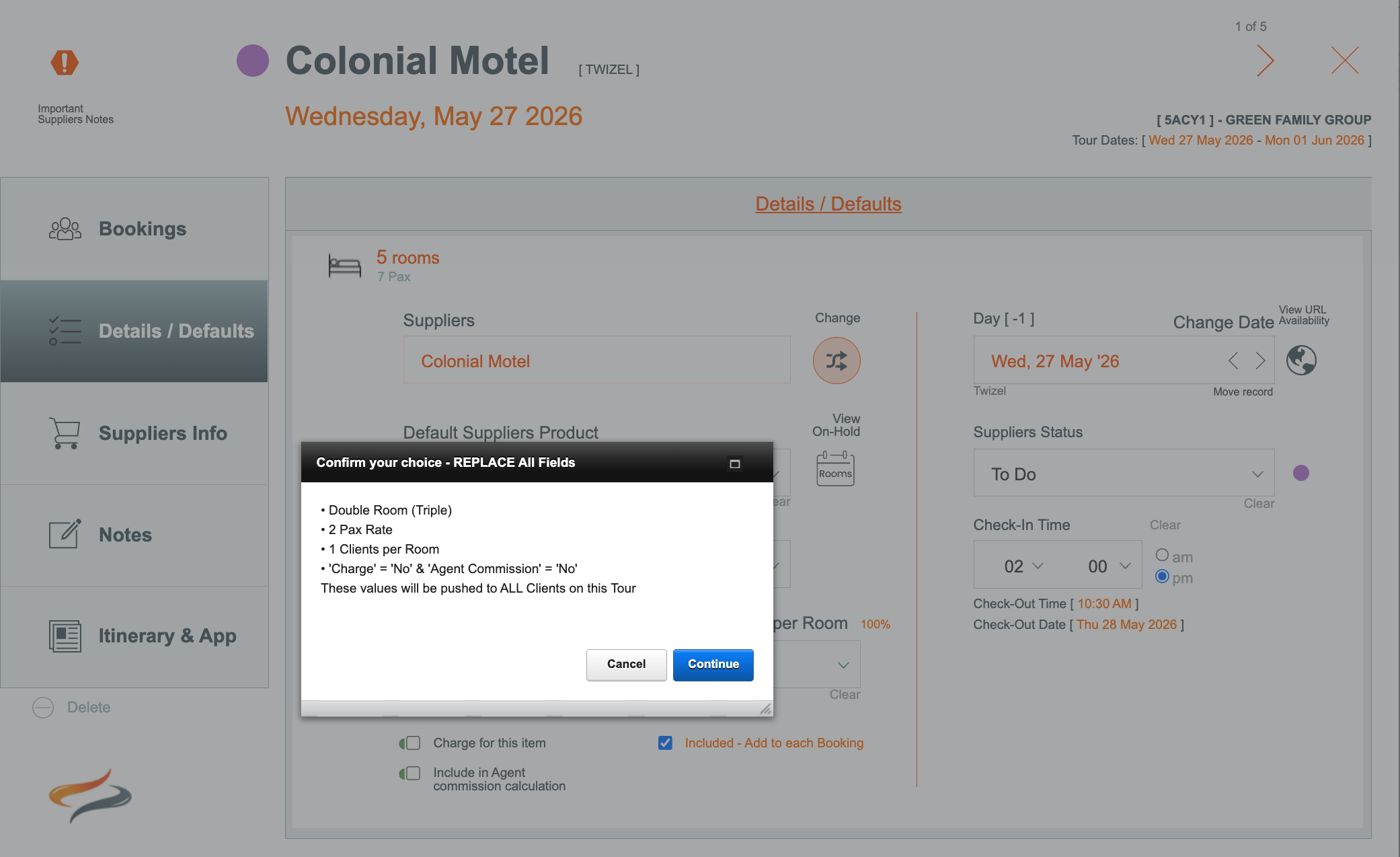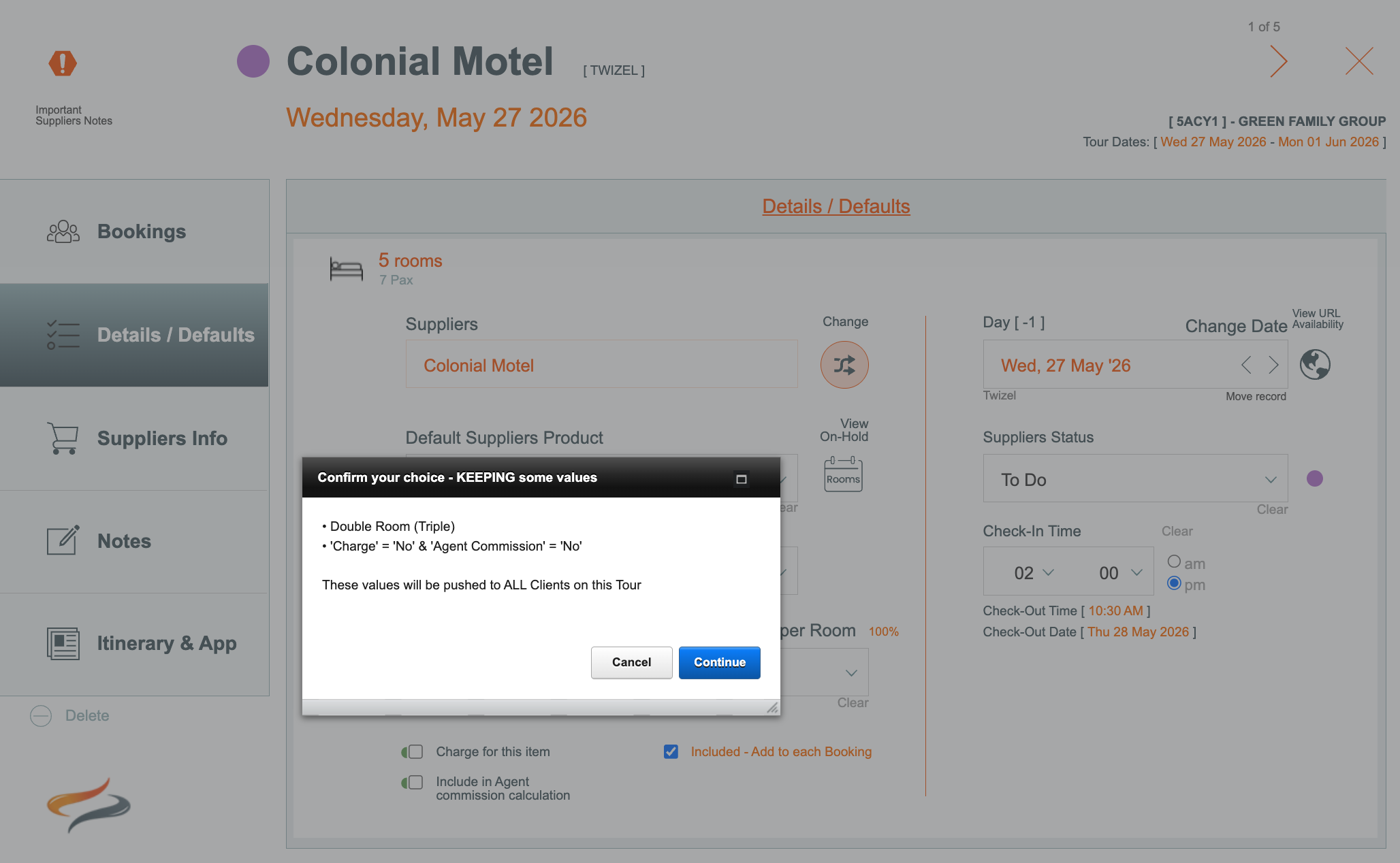 - Click Continue if you are wish to REPLACE the Room type, pax rate, clients per room, room type, Charge and Agent Commission calculations for client's on this tour.