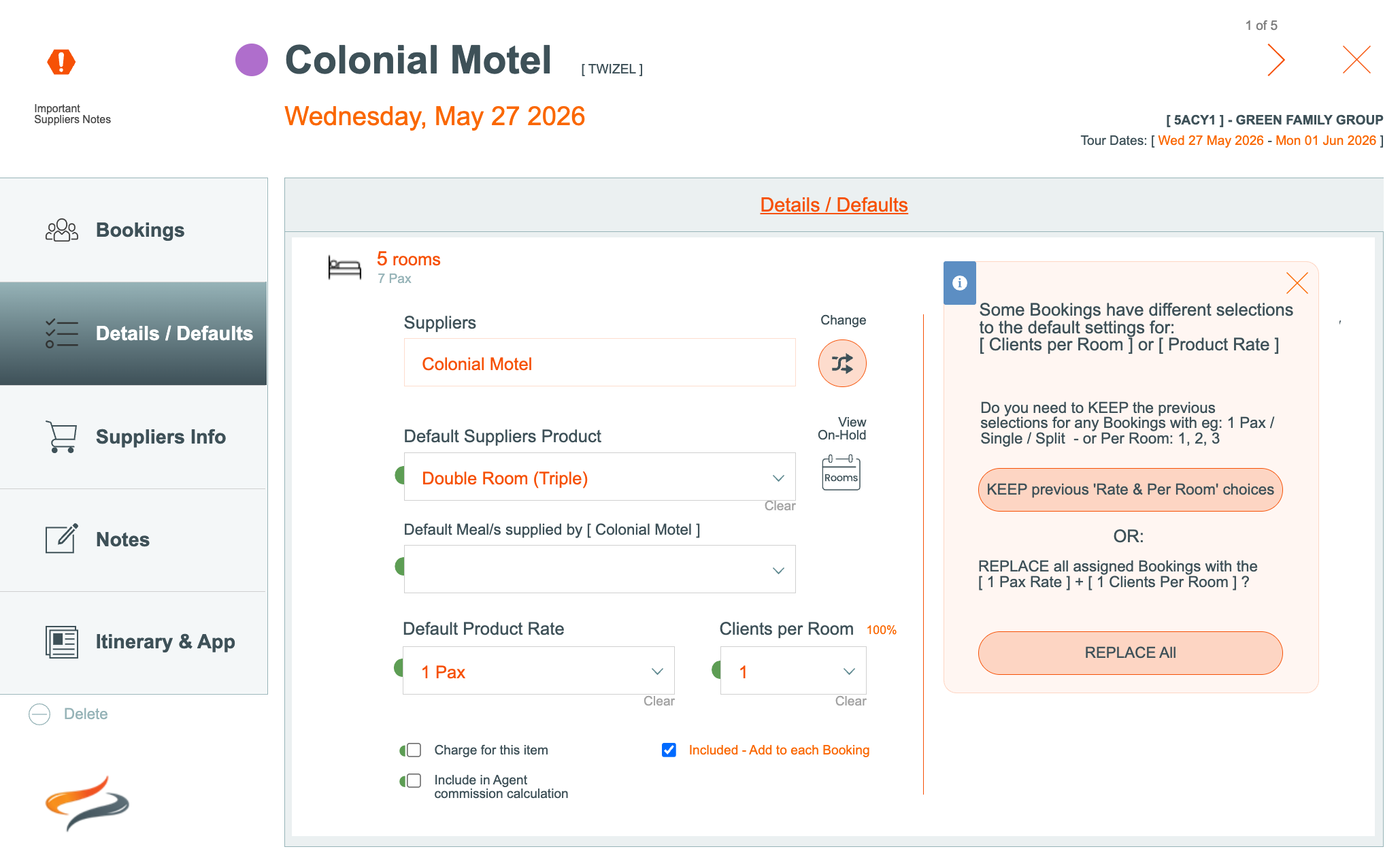 - OR do you wish to REPLACE all assigned Bookings with the 2 PAX Rate and 1 Client per room (if so click the button for REPLACE All)