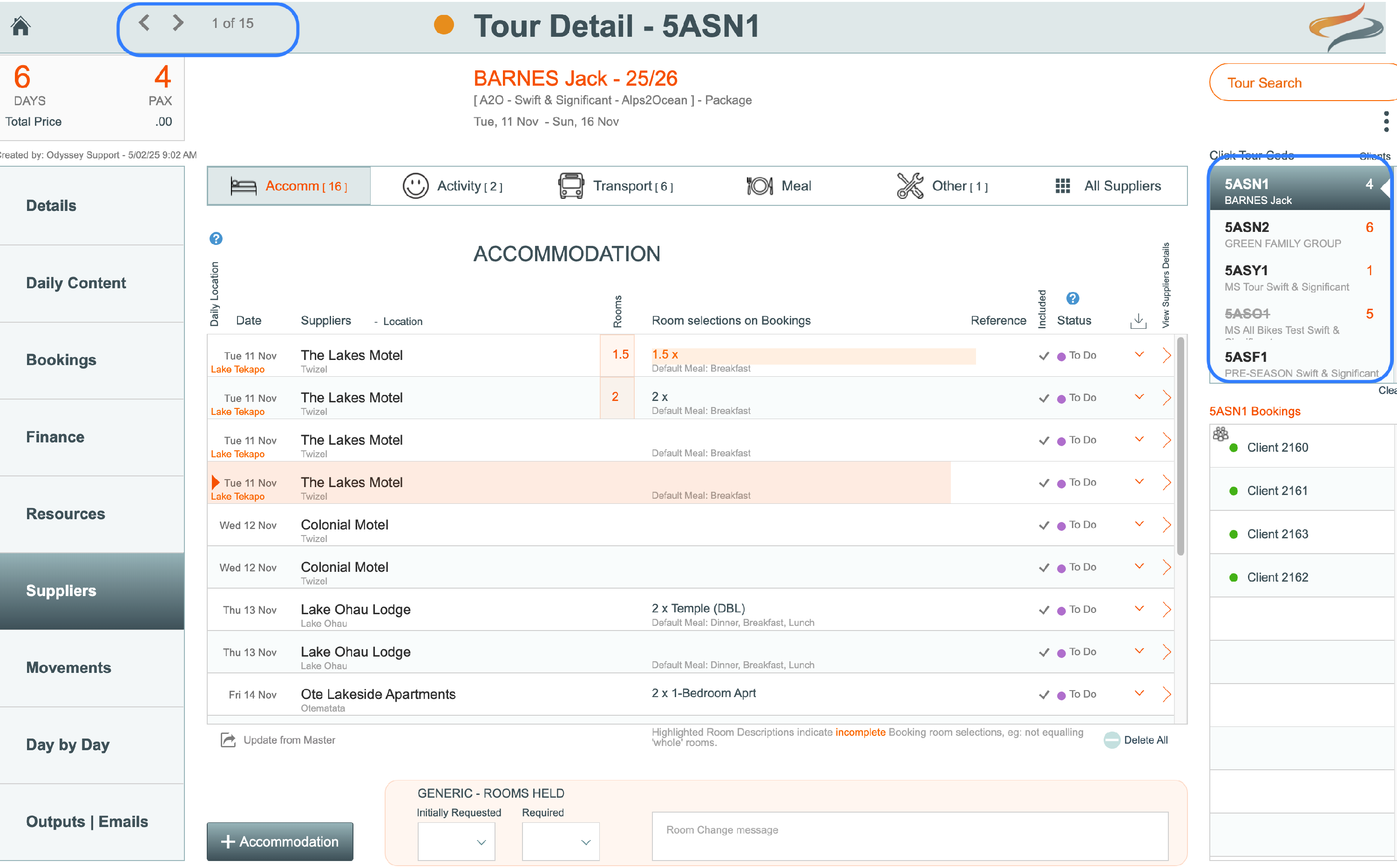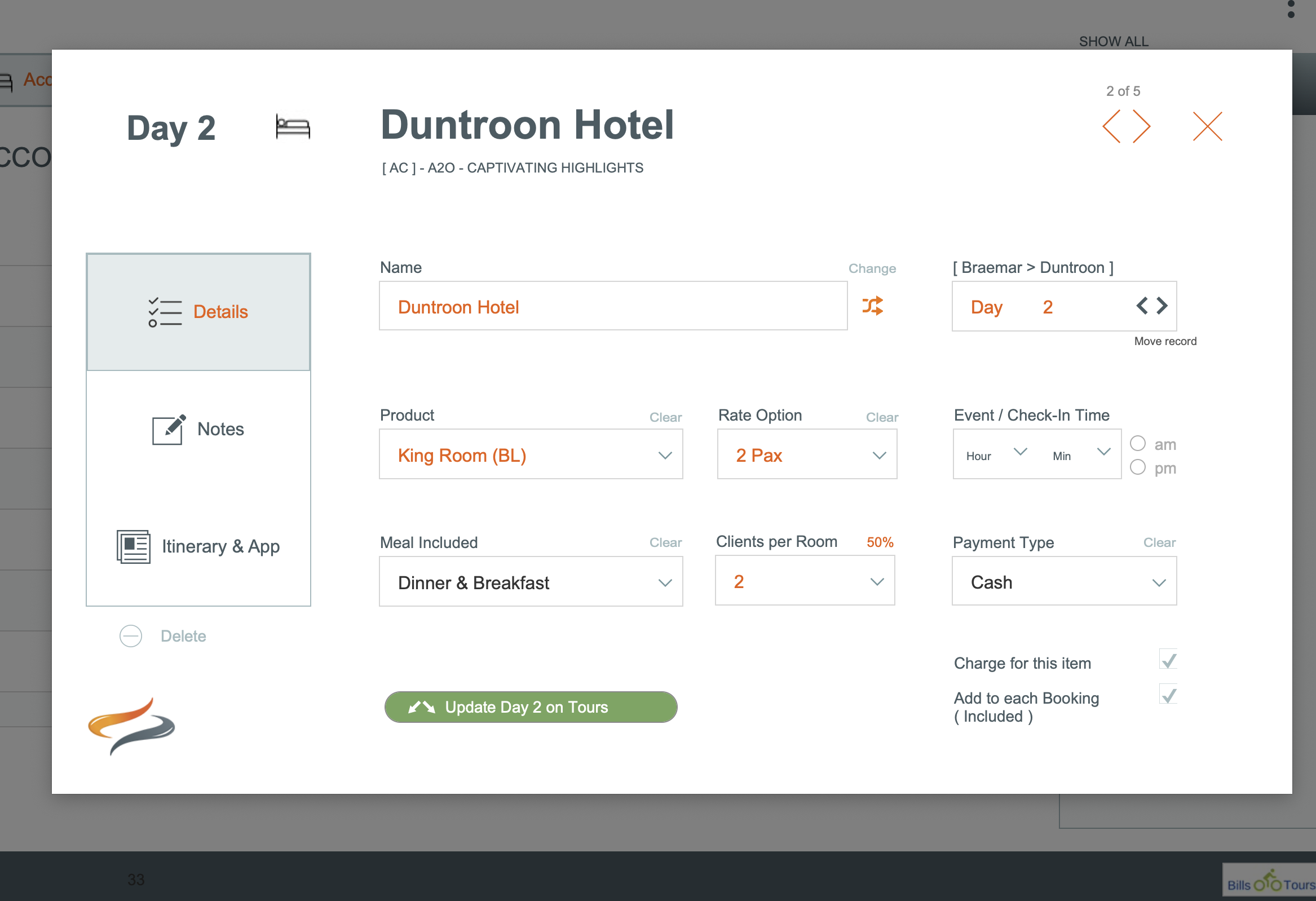 Note too, that some Tours may have multiple instances of this particular day, e.g. there may be two or three Day 2's on this tour, to cater for different accommodation providers on this tour. EVERY Day 2 will be impacted by the "Update to Day 2" on Tours button.