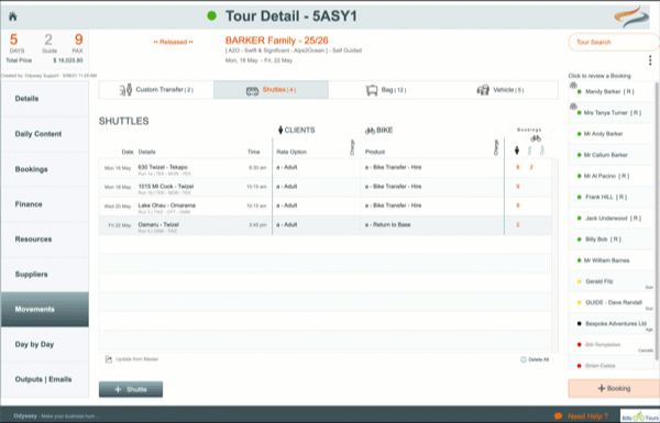 - On the Tour | Movement | Shuttle | Bookings tab: