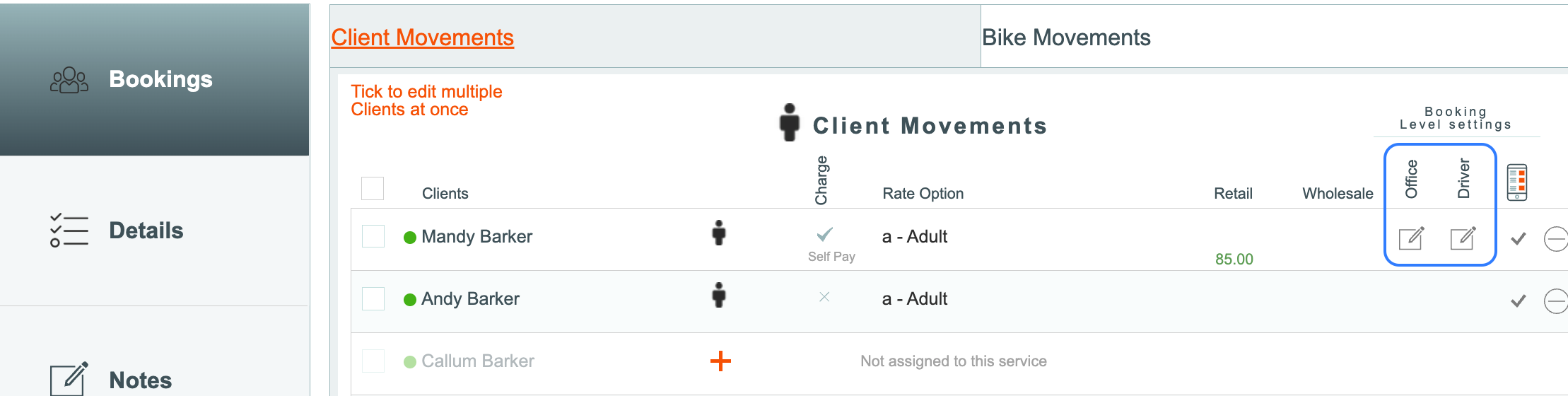 - The charge tickbox can be ticked or unticked from the Bookings | Client Movements tab