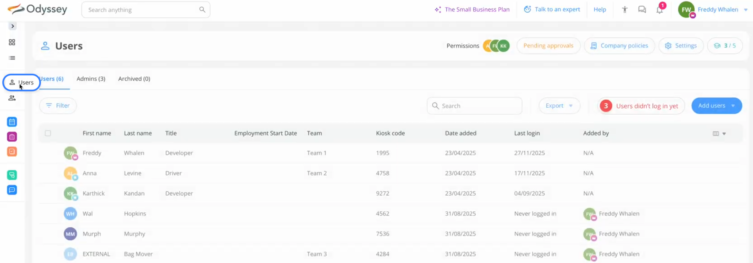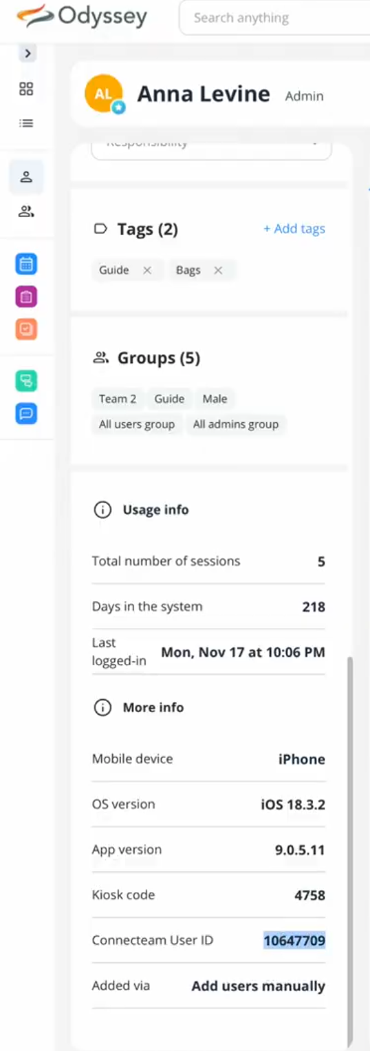 - find the code in Connecteam here: Main Menu | Users | select a user | scroll to bottom to find Connecteam User ID | copy and paste this into Odyssey's CTUserID field