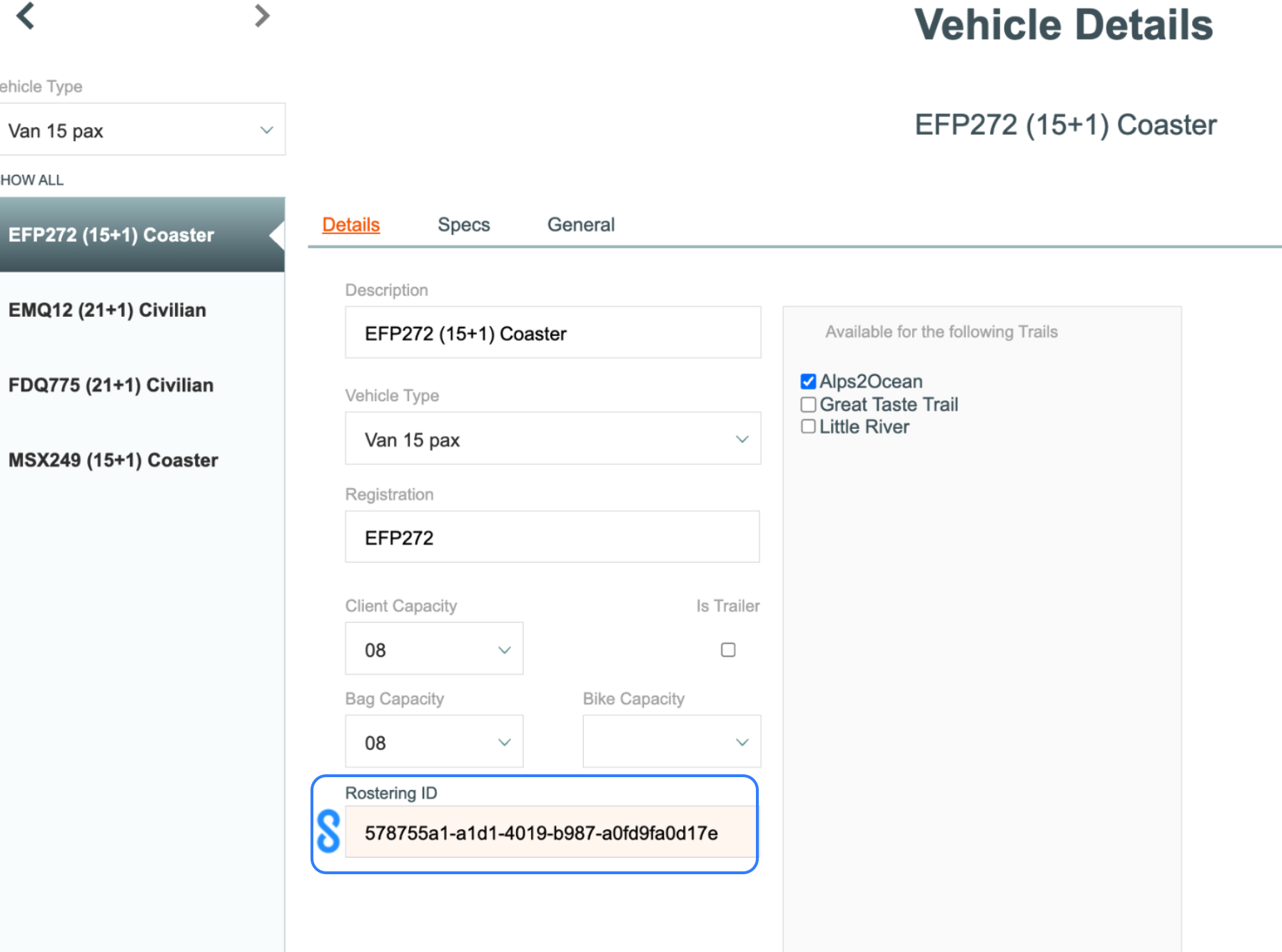 Enter the ID number for Vehicles provided by Odyssey in the Rostering ID field