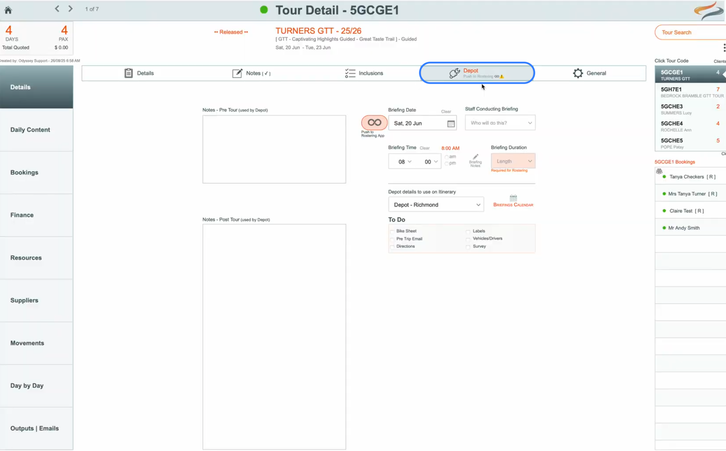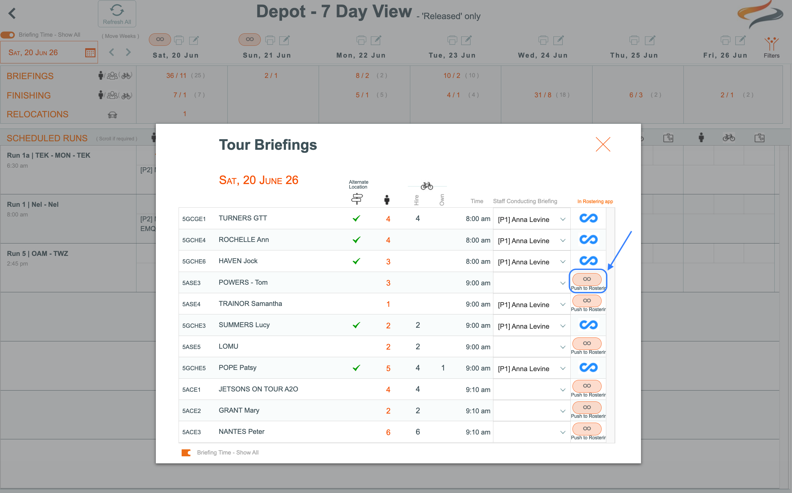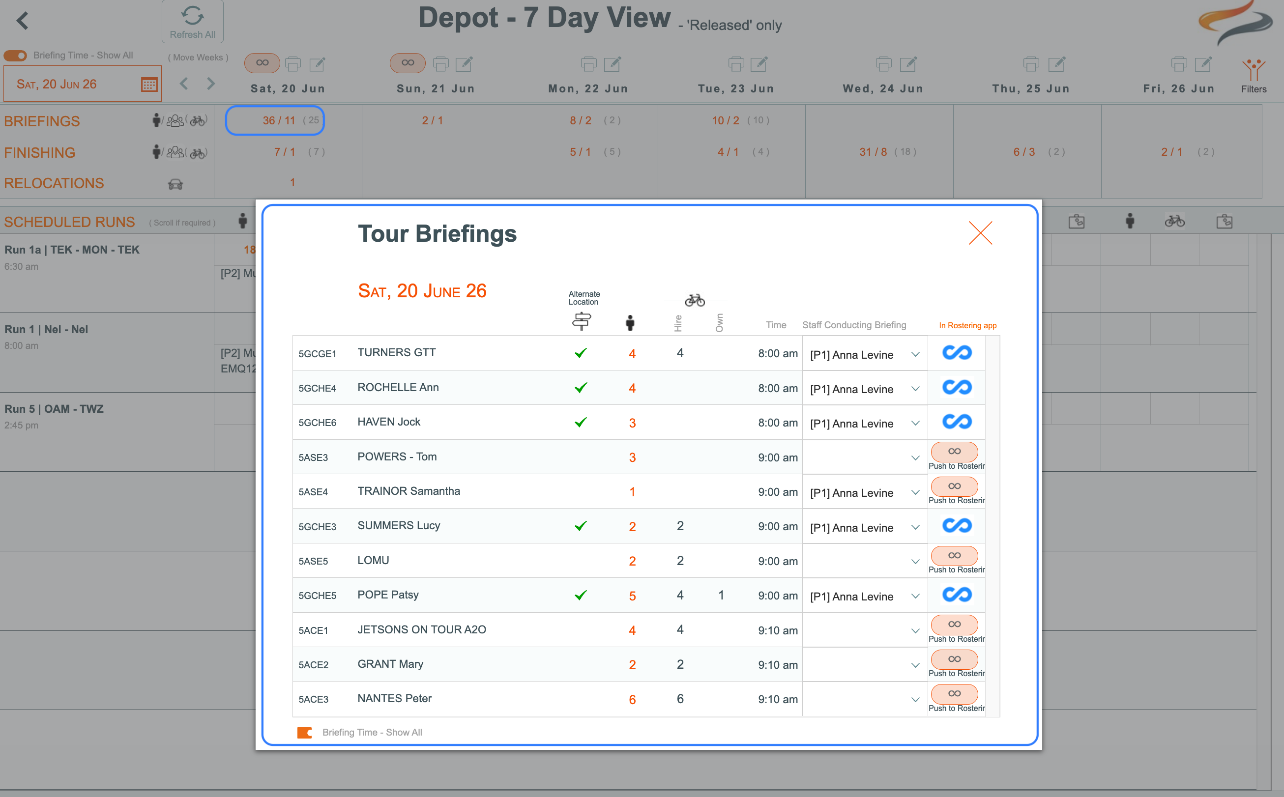 - On each shift that has been pushed from Odyssey, the Tour Code, number of people, bags and maybe bikes, and time will be shown, as these factors may influence the skillset of the person who is running the briefing, and how long it will take, etc.