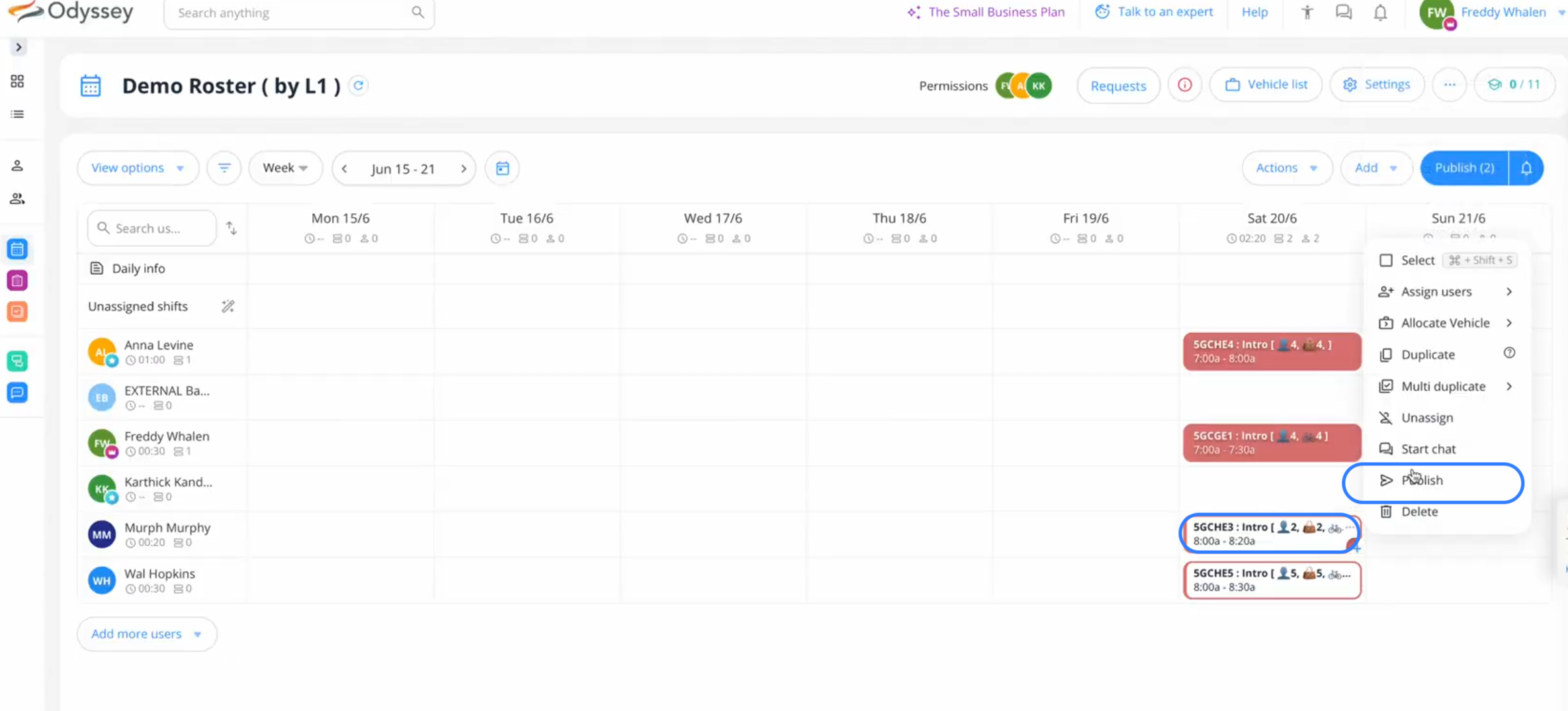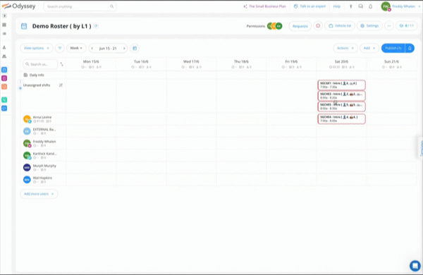 - Assign shifts to team members by dragging and dropping them from the Unassigned shifts to a specific team member, or from one team member to another