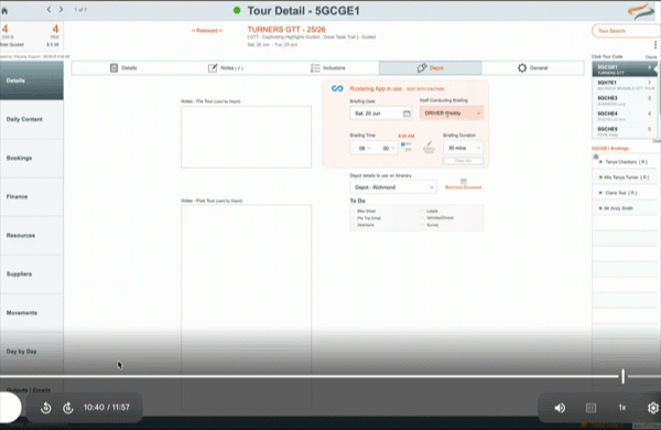 NOTE: Once the briefing details have been pushed to Connecteam, the entire Briefings area of the Depot tab will be coloured peach. This reminds Reservations staff that these records have been pushed to the depot for rostering and planning purposes, and that they must edit these fields with caution, following their own internal company processes/protocols. e.g. The depot manager may need to be contacted in order for them to review their planning for this day.