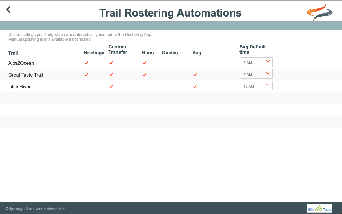 For users of Odyssey's Advanced Connecteam / Rostering module, a daily "Push" from Odyssey can automatically update Connecteam's Briefings, Custom Transfers, Runs, Guides and Bag movement records. These automations can be managed by trail.
