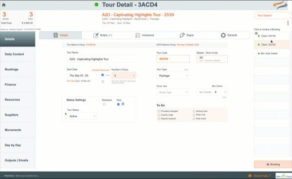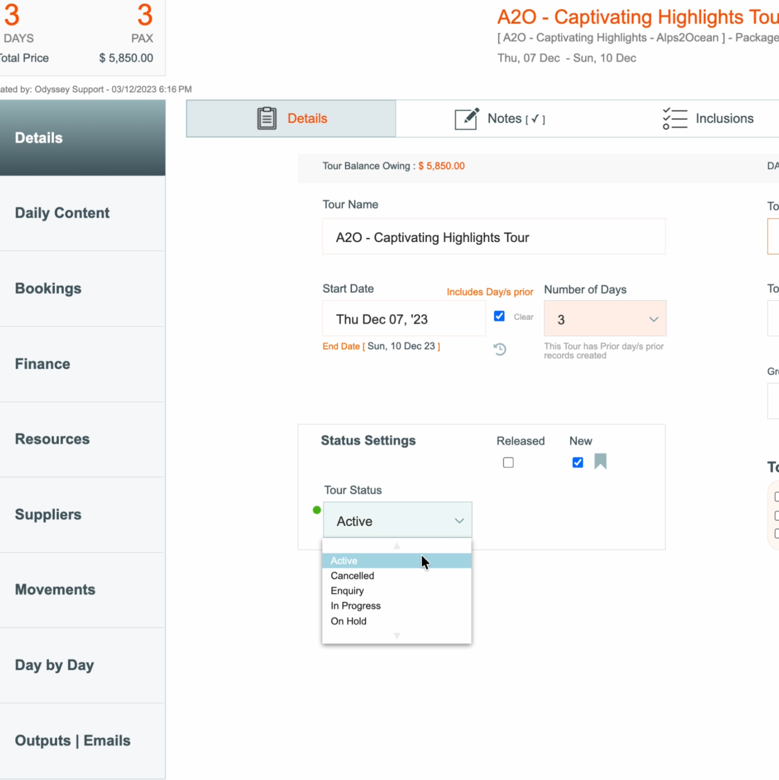 - select a different Tour status from the drop down list, e.g. from Confirmed to Cancelled