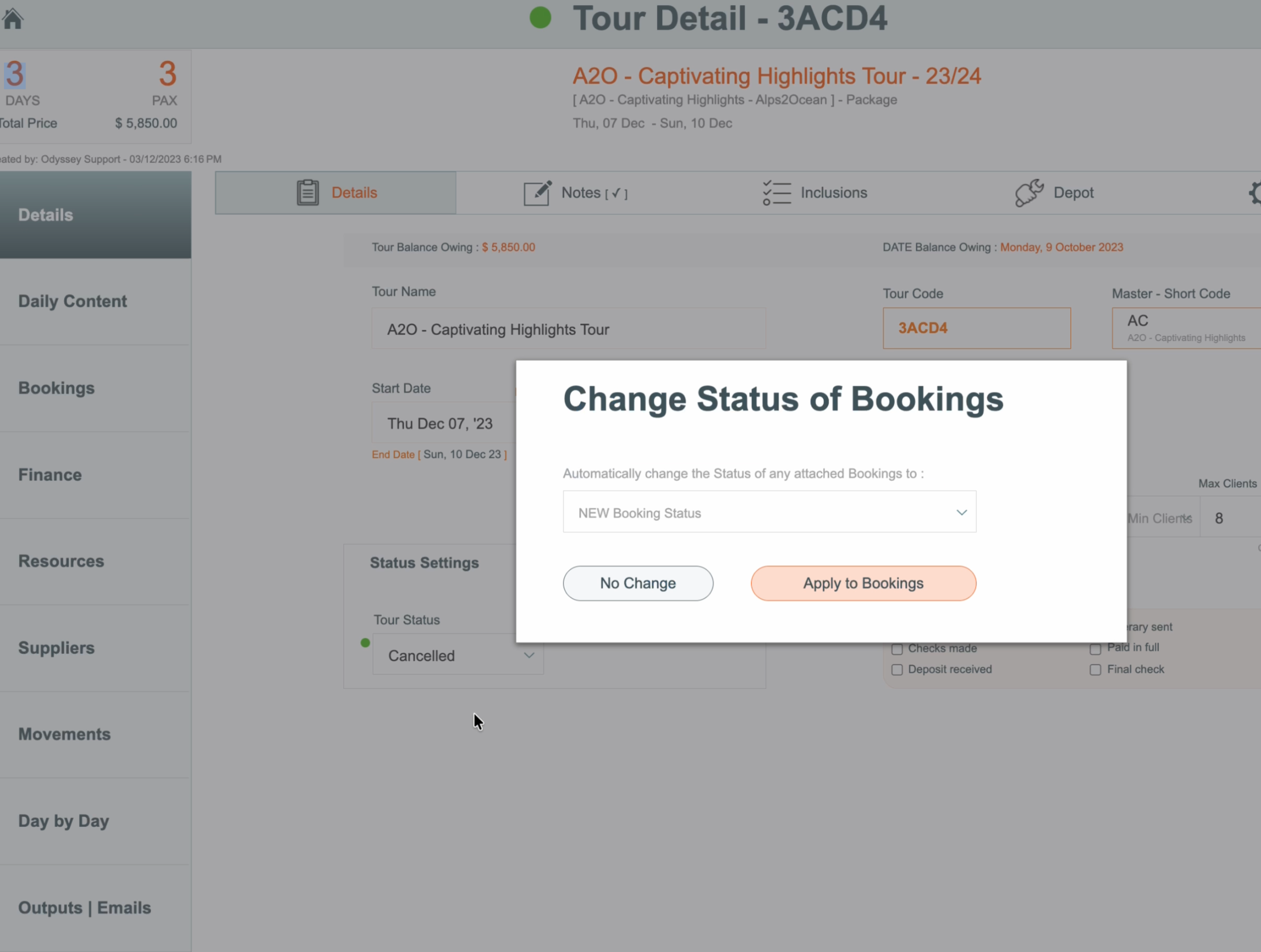 - You will then be presented with the option of applying that same status, to the Bookings on this Tour